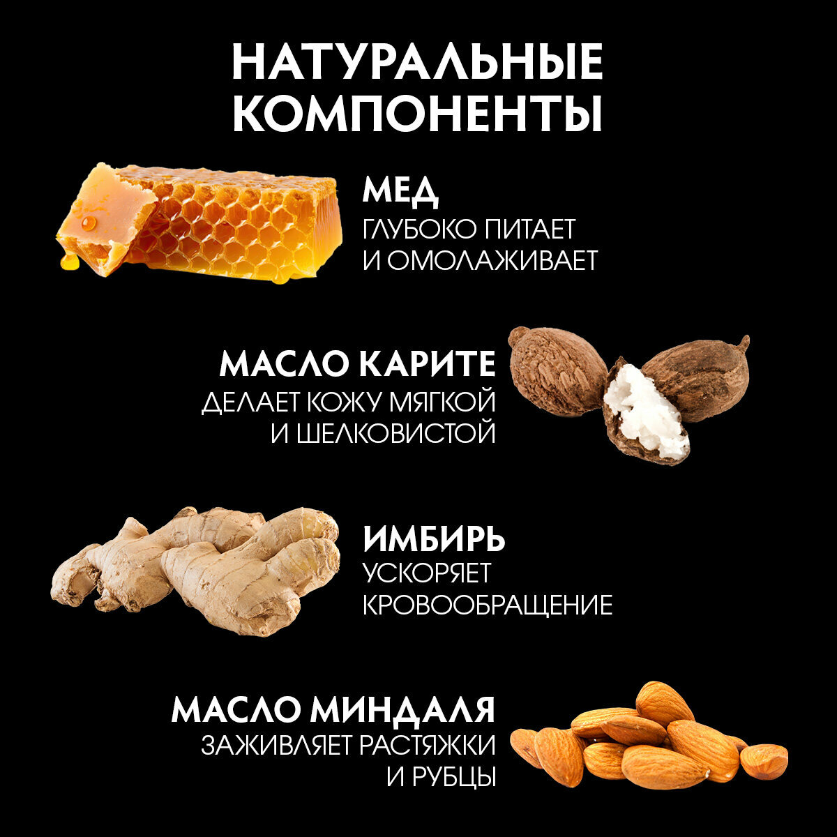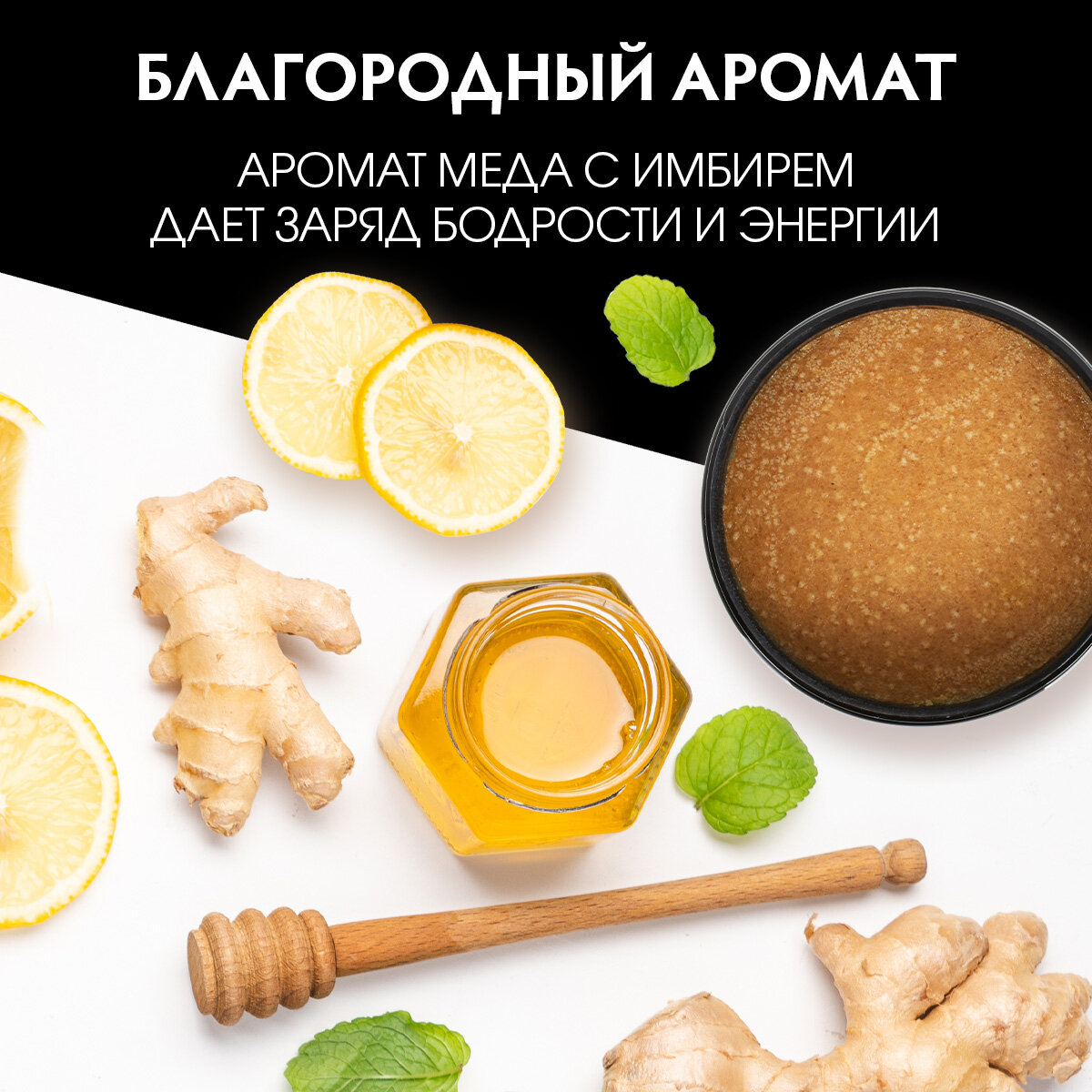 Медовое обертывание идеально подходит, как для юной, так и для зрелой кожи. Обладает разогревающим действием, выравнивает поверхность кожи и возвращает ей упругость. При регулярном применении способствует избавлению от растяжек и рубцов на коже. Мед содержит большое количество глюкозы и фруктозы, легко проникает вглубь пор и помогает выводить из организма токсины. Это прекрасное средство для борьбы с целлюлитом и его профилактики. Аромат меда с имбирем дарит заряд бодрости и энергии. Не содержит красителей и ароматизаторов.
