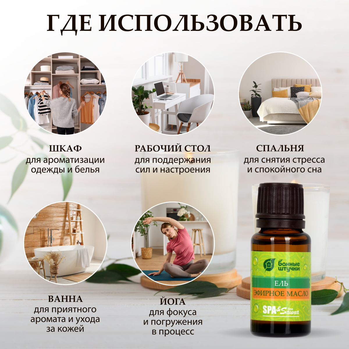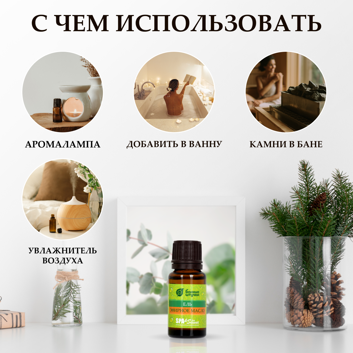 Сауна, баня, горячая ванна – идеальное место для использования масел. В сочетании с разогретым воздухом в парилке масла усиливают свое воздействие, облегчают дыхание, благотворно влияют на кожу. Эфирное масло «Банные штучки» поднимет настроение, создаст атмосферу спокойствия и гармонии.
