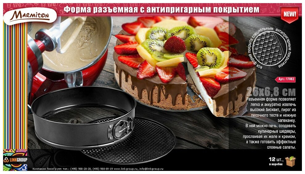 Прочие особенности и свойства | MARMITON 17082 Форма с антипригарным покрытием для выпечки разъемная 26х6,8см для выпечки кондитерских изделий. Разъемная конструкция позволяет легко и удобно извлекать готовую выпечку из формы, не повреждая ее, а также мыть форму после ее применения. |