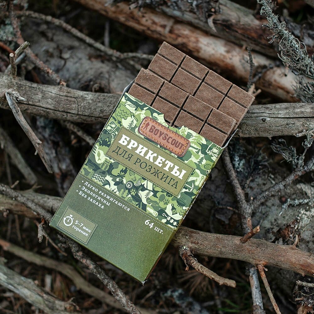 Брикеты для розжига Boyscout сделаны из вторично переработанной древесины. Если вы любите ходить в походы, то эти брикеты вам точно пригодятся, ведь в экстренной ситуации с ними намного проще разжечь костер, а также в дальнейшем поддерживать его пламя. Время горения одного брикета: минимум 5 минут. В упаковке две плитки по 32 брикета каждая. Брикеты изготавлены из прессованных опилок пропитанных воском. Изделие является экологически-чистым сухим розжигом. Температура горения: 800 градусов.