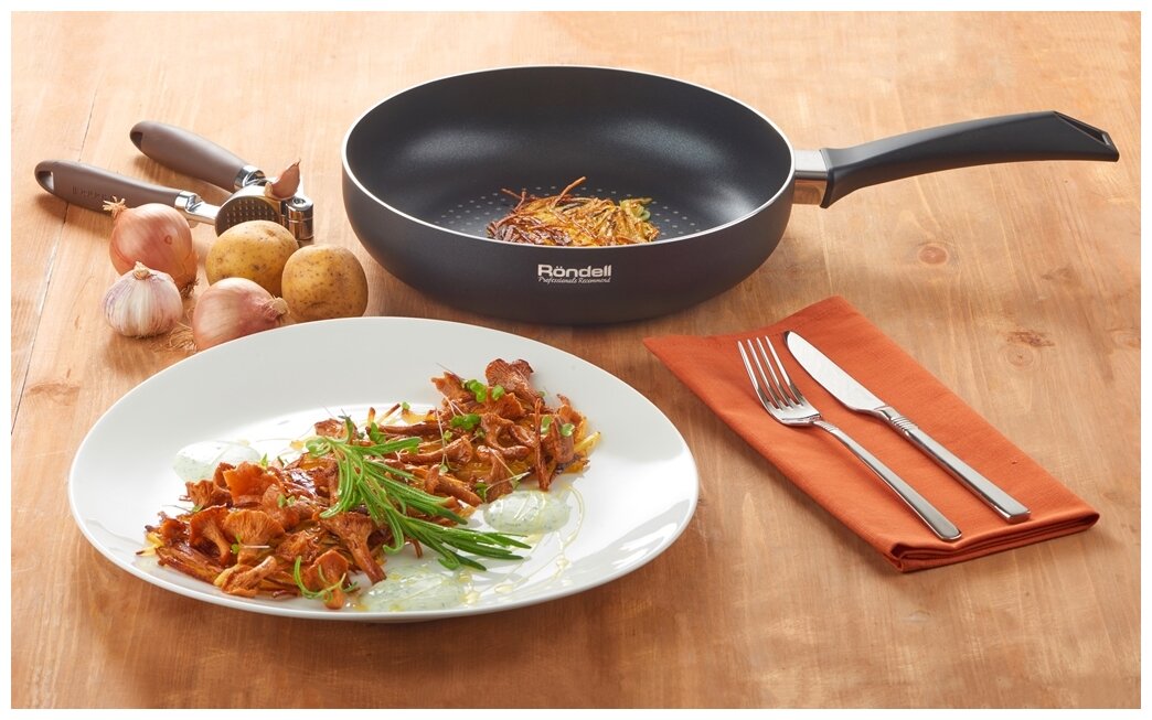 Сковорода Rondell Arabesco 26 см Диаметр: 26 см. Материал - штампованный алюминий. Толщина стенок - 2.5 мм. Толщина дна - 2.5 мм. Внешнее покрытие - матовый, силиконовый полиэстер устойчивый к высоким температурам. Внутреннее покрытие - двухслойное, долговечное антипригарное покрытие для интенсивного использования Xylan Plus®. Высокие стенки корпуса. Принт на дне сковороды. Ручка из бакелита с силиконовым напылением. Надежное клепочное крепление аксессуаров. Упаковка - картонный рукав. Подходит для всех видов плит, кроме индукции. Подходит для посудомоечной машины.