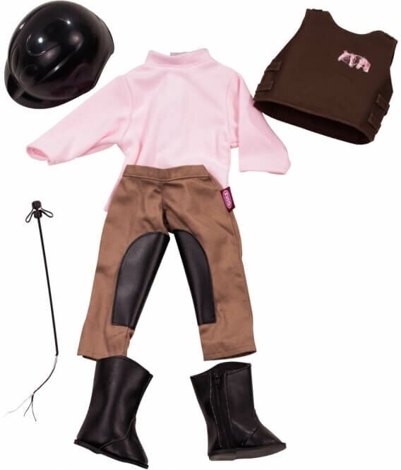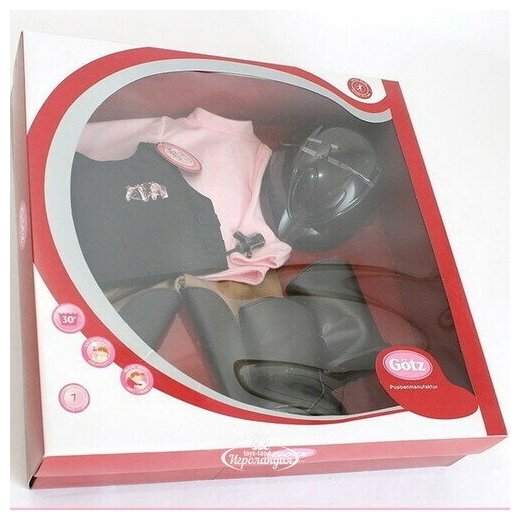 Набор одежды Gotz 3401553 для верховой езды - 45-50 см Для верховой езды любой маленькой наезднице обязательно нужно приобрести такой комплект одежды, ведь все в нем продумано до мелочей. Коричневые брюки с внутренней стороны бедер имеют противоскользящие кожаные вставки, изящная розовая рубашка не сковывает движения, а черный шлем надежно защищает голову наездницы от возможных травм в случае падения.