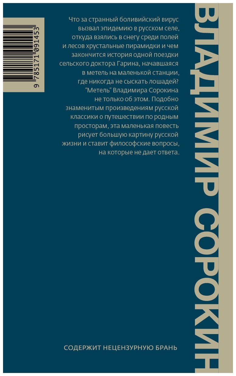 Повесть Владимира Сорокина не только об этом. Поэтичная, краткая и изысканная " Метель" стоит особняком среди книг автора. Подобно знаменитым произведениям русской классики о путешествии по родным просторам, эта маленькая повесть рисует большую картину русской жизни и ставит философские вопросы, на которые не дает ответа.