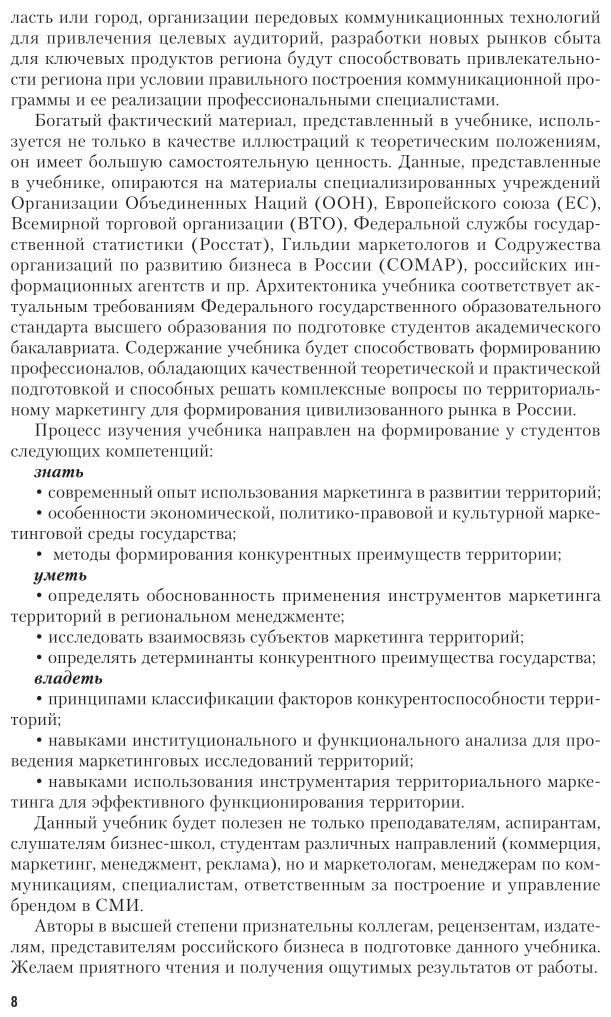 Учебник в полной мере раскрывает специфику маркетинга территорий. Приводятся конкретные направления и примеры использования инструментов территориального деления, бенчмаркинга для успешного позиционирования на рынке, показаны особенности региональных исследований. Рассматриваются варианты построения карты регионального рынка продаж и схемы распределения продукции по сбытовым каналам, даны практические кейсы формирования брендинга территории. Впервые предложены к рассмотрению и раскрыты этапы планирования финансово-экономического обеспечения логистической системы с учетом территориального фактора. Анализируется инвестиционная инфраструктура управления территорией в условиях интеграционных процессов. Содержание учебника соответствует актуальным требованиям Федерального государственного образовательного стандарта высшего образования. Для бакалавров, обучающихся по экономическим направлениям подготовки, маркетологов, менеджеров по коммуникациям, предпринимателей, государственных служащих в сфере регионального развития, а также для широкого круга специалистов-практиков, интересующихся возможностями продвижения территорий.