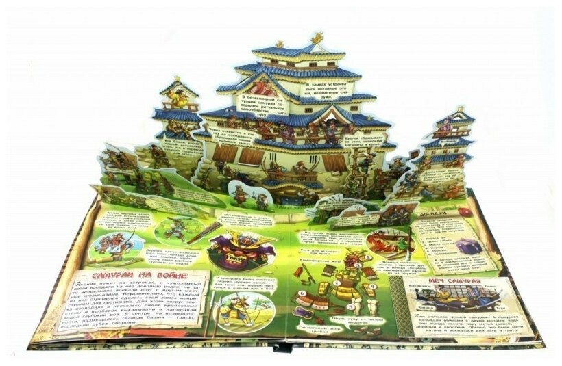 В книге множество открывающихся клапанов и подвижных элементов, карточная игра "10 самураев", объёмный замок и прочие интерактивные элементы - всё, чтобы заинтересовать ребёнка книгой-игрой и загадочным миром прошлого.