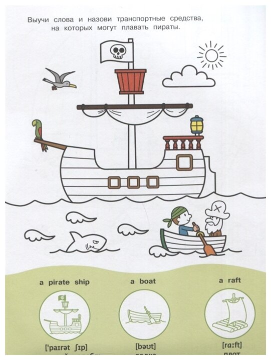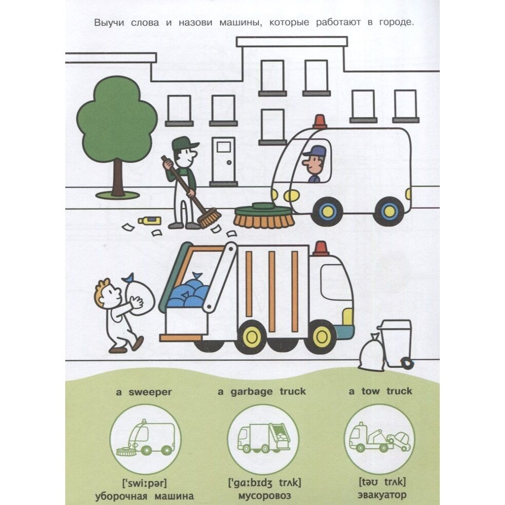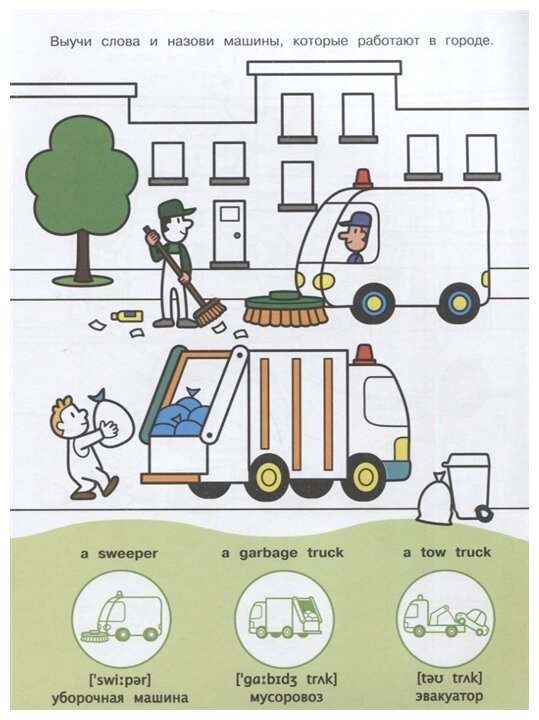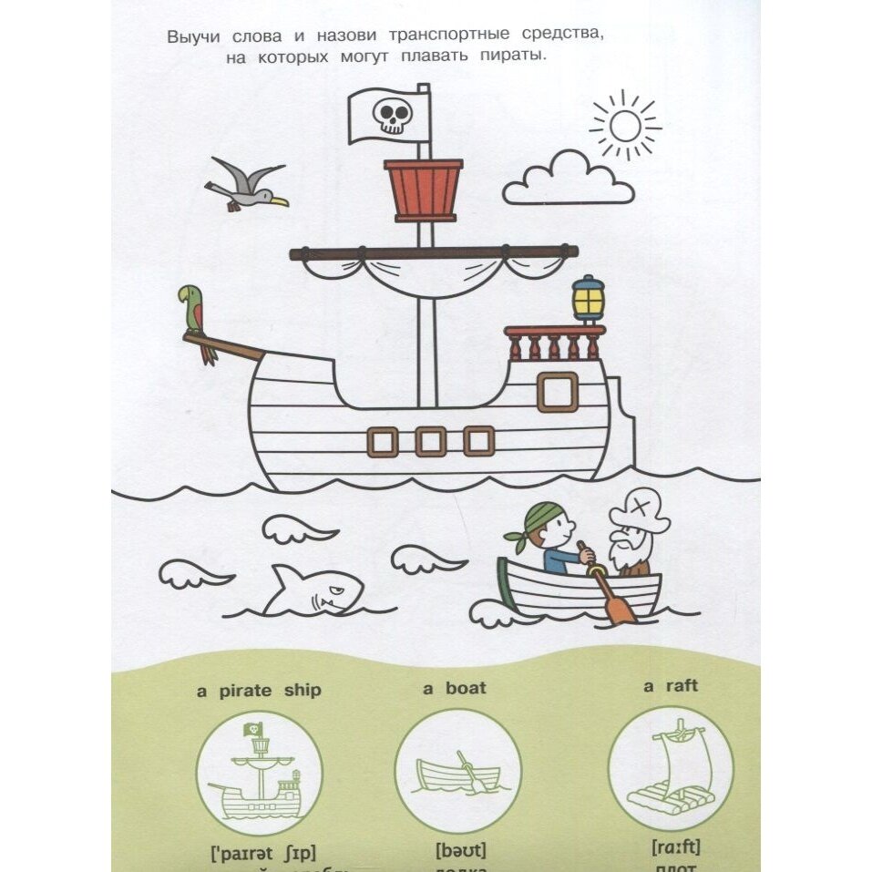 Удачная книга. Удачная серия. Редкая тема транспорт, плюс словарь только с наклейкой и англ словом, без русских,, как читается,,. Плюс слово с артиклем, что вообще редкость. Картинка--раскраска позволяет составить рассказ описание, отработать лексику. Спасибо издательству за такие правильные книги. Ждем продолжения. Семья, внешность, погода и т п...
