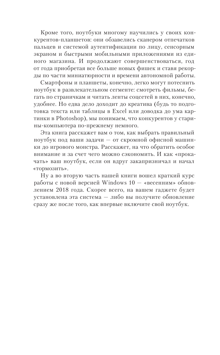 Новый полный самоучитель по работе на ноутбуке от Виталия Леонтьева, автора компьютерных книг №1 в России (более 100 книг, более 5 миллионов общего тиража). По традиции книга написана с юмором, в ней нет долгих объяснений и скучных схем - автор делает первое знакомство читателя с ноутбуком веселым и интересным. Это книга для людей с активной позицией, которые не боятся узнавать что-то новое, хотят быть на одной волне со своими детьми, внуками, с коллегами по работе. Даже для тех, у кого уже есть ноутбук и он немного умеет с ним работать, эта книга будет полезна, ведь читатели узнают много новой и полезной для себя информации и станут более продвинутыми пользователями.