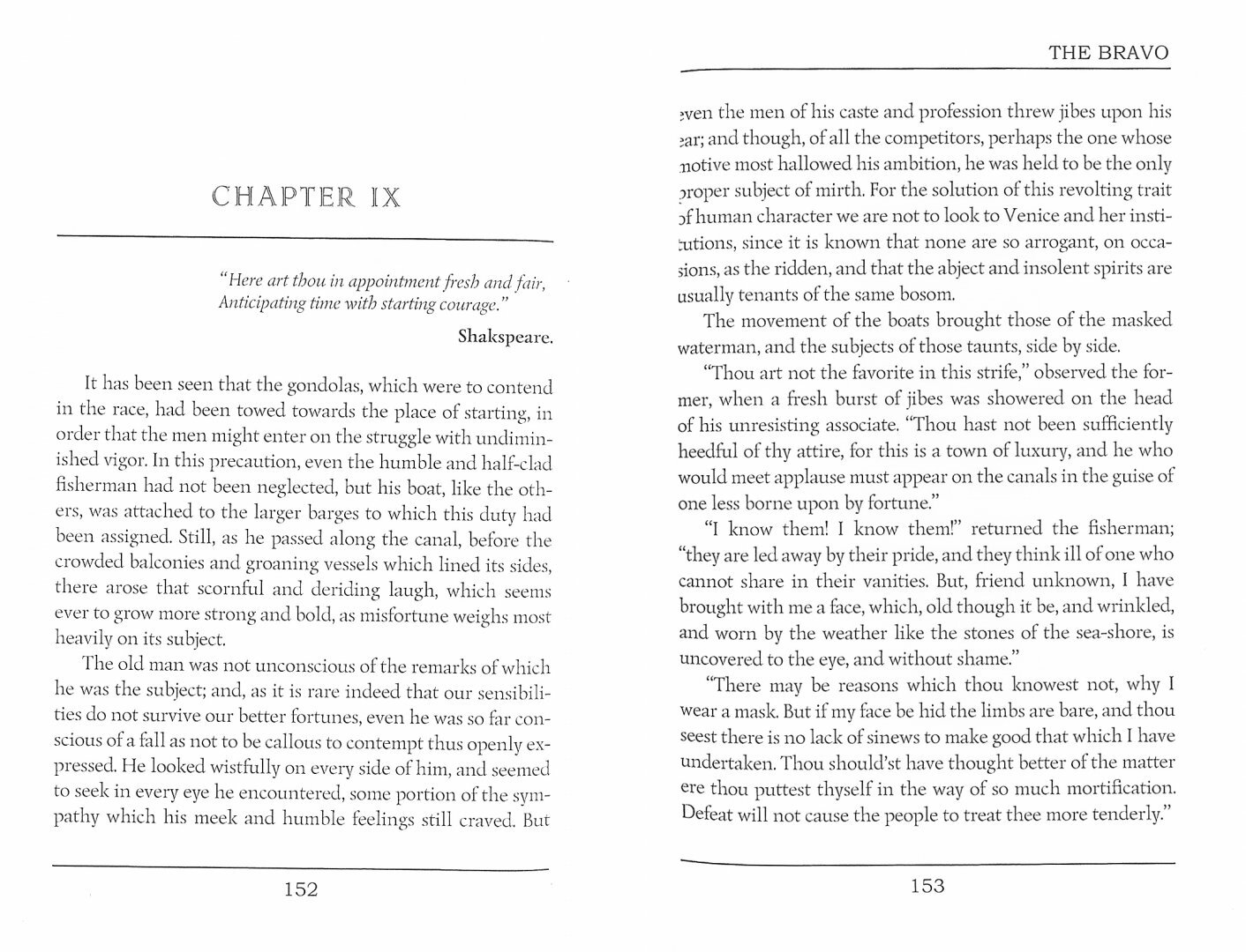 Браво – как мне кажется, не та книга, с которой стоит начинать знакомство с автором, а вот давним поклонникам Купера она придётся очень даже по вкусу. В книге он довольно часто противопоставляет венецианский и американский стили правления, и поскольку таких вставок в книге немало, они как раз могут подпортить впечатление новичку, ещё не знакомому с творчеством и взглядами Купера. Помимо этого, Купер ещё много размышляет в этой книге о человеческой природе, о том, по каким критериям мы строим суждения друг о друге, и мастерски проводит анализ авторитарного общества.