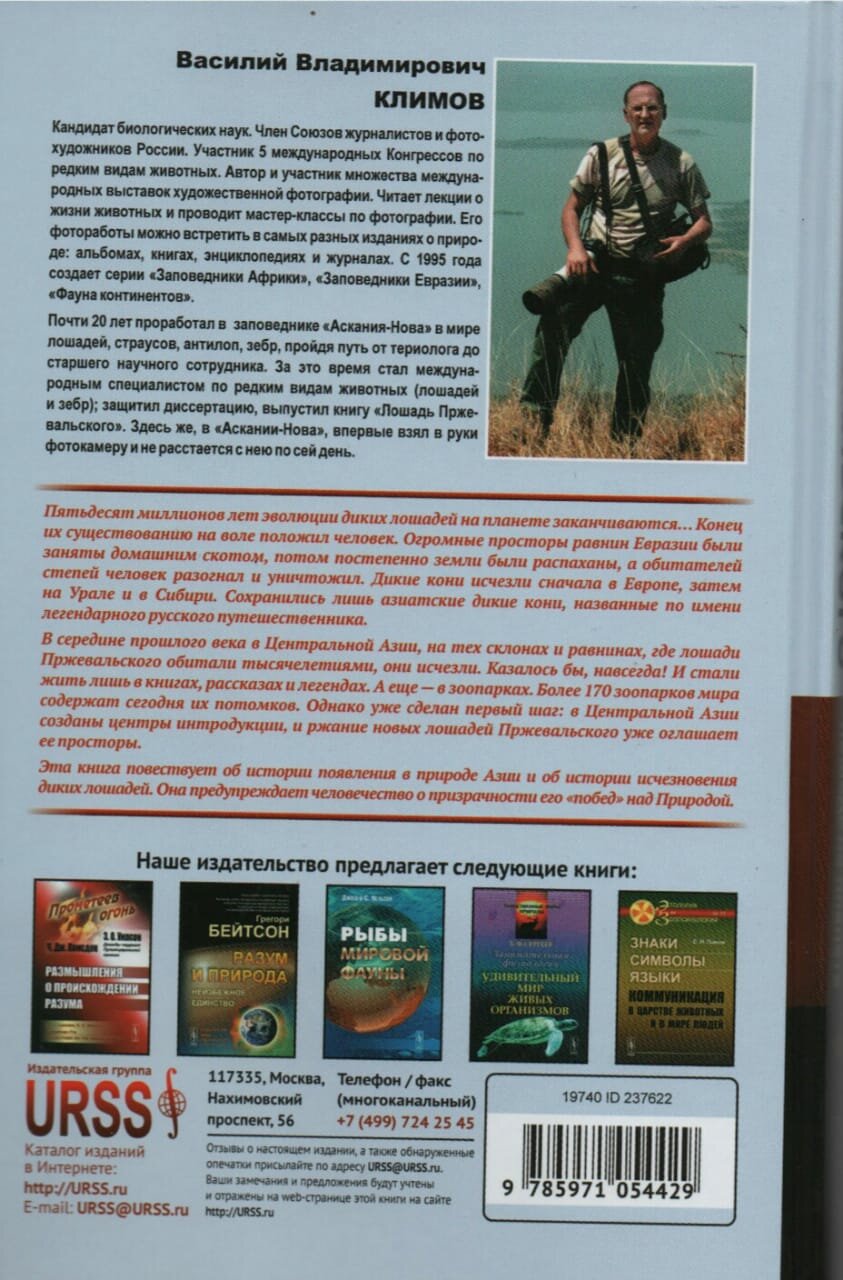 Монография посвящена лошади Пржевальского — эндемику Центральной Азии, редкому виду и последней дикой лошади на планете. Раскрываются история возникновения непарнокопытных в Евразии, особенности биологии диких лошадей в природе и неволе, взаимоотношения с человеком, разнообразные формы поведения, помогающие им выжить на открытых просторах суровой природы Азии. Описана история открытия, изучения, поимки и завоза лошадей в Европу, расселения по зоопаркам мира и формирования современных линий, а также проблемы сохранения и возвращения в природу. Адресуется широкому кругу читателей, интересующихся зоологией, проблемами охраны природы и взаимодействия человека с животным миром.