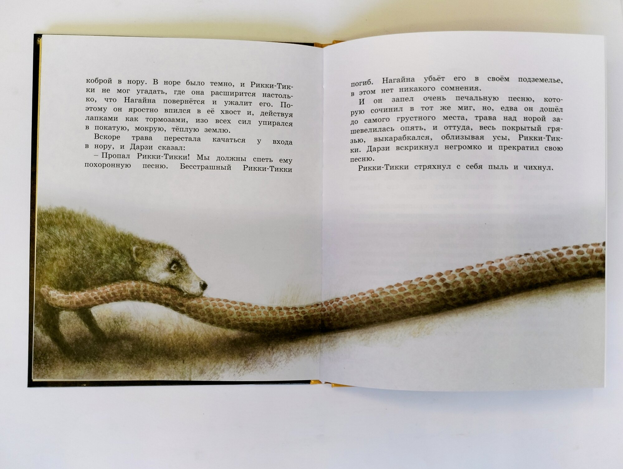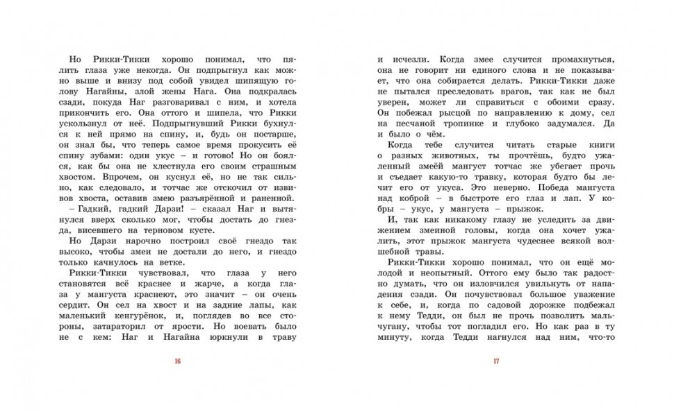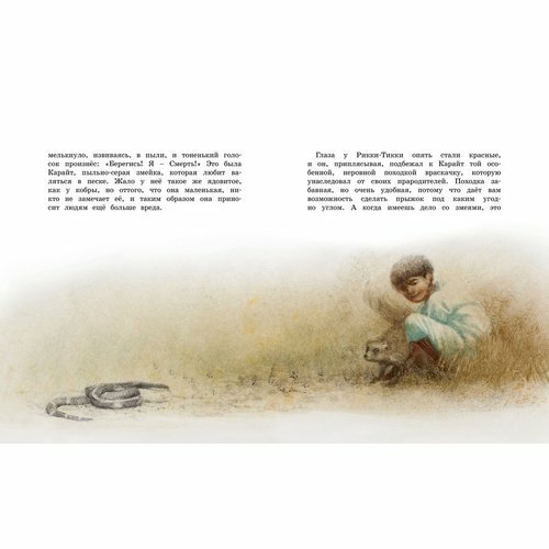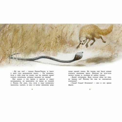 История о смелом мангусте, известная с детства. История о доброте, верности и дружбе. Выбрать издание в коллекцию было не сложно. Ингпен проиллюстрировал ее просто шикарно. Отсутствует мультяшность, иллюстрации детальные, сдержанная цветовая гамма. Стиль Ингпена очень узнаваем, и именно по этой причине нет желания приобретать много книг с его иллюстрациями. Хочется, разнообразия, столько сейчас замечательных иллюстраторов. Сложно определиться, какое издание с какими иллюстрациями выбрать. Но вот Рикки-Тикки-Тави я вижу для себя именно с иллюстрациями Ингпена. Иллюстрации превратили и без того замечательную историю в шедевр книгопечатания..
