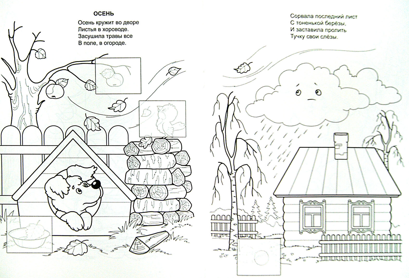 Раскраска формата А4 отличного качества. Наклейки - это фрагменты картинки для раскрашивания. При изучении времен года - идеальный материал для занятий с ребенком. Дает возможность обсудить с ребенком приметы наступления осени, подготовку к зиме людей и животных, изучить перелетных птиц. Стихи хорошие. Аудитория 2-7лет.