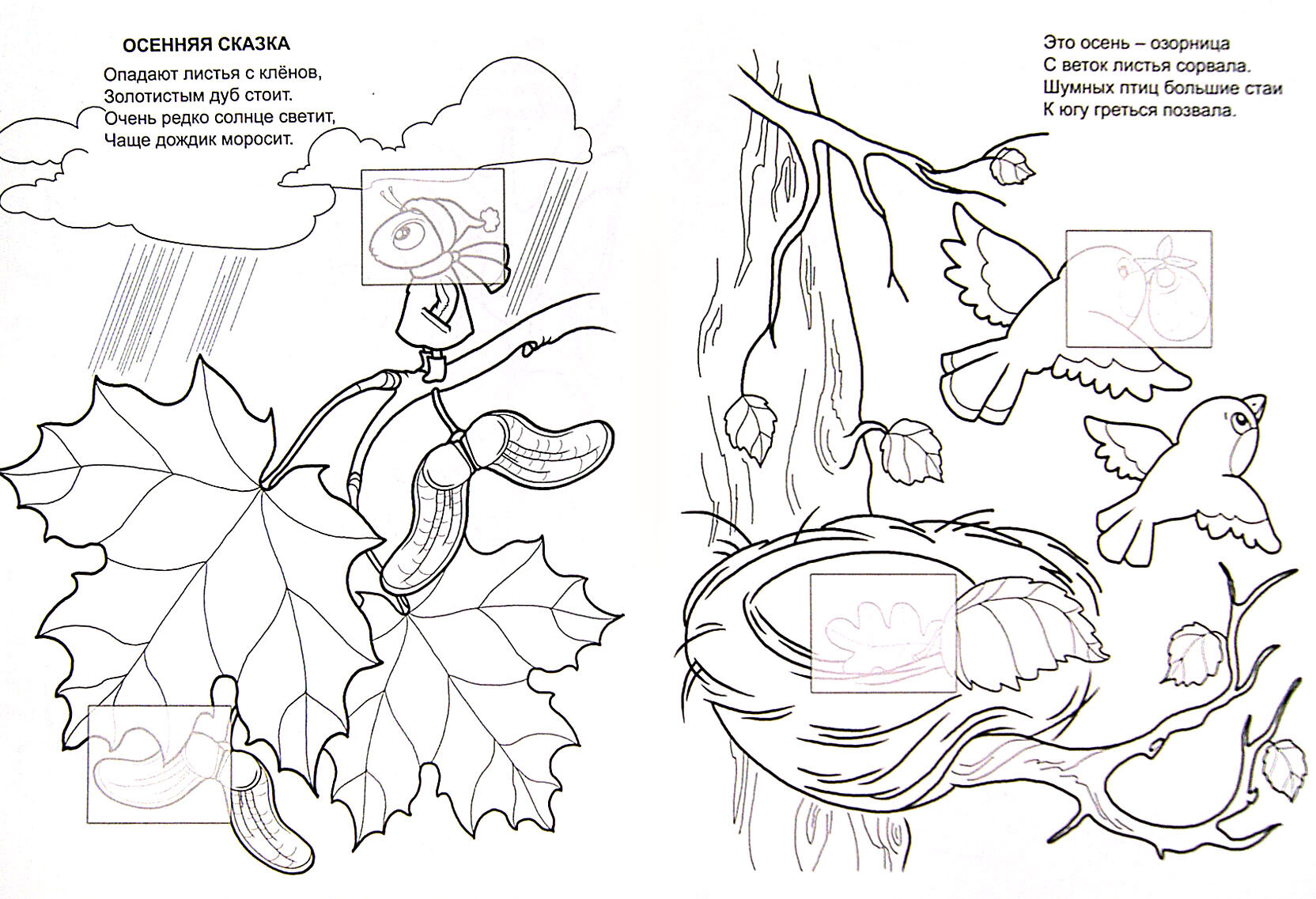 Книжка-раскраска с наклейками. Красивые рисунки и веселые стихи об осени помогут вашему ребенку скрасить досуг. В книге также есть наклейки, которые надо подобрать и наклеить на нужные страницы.