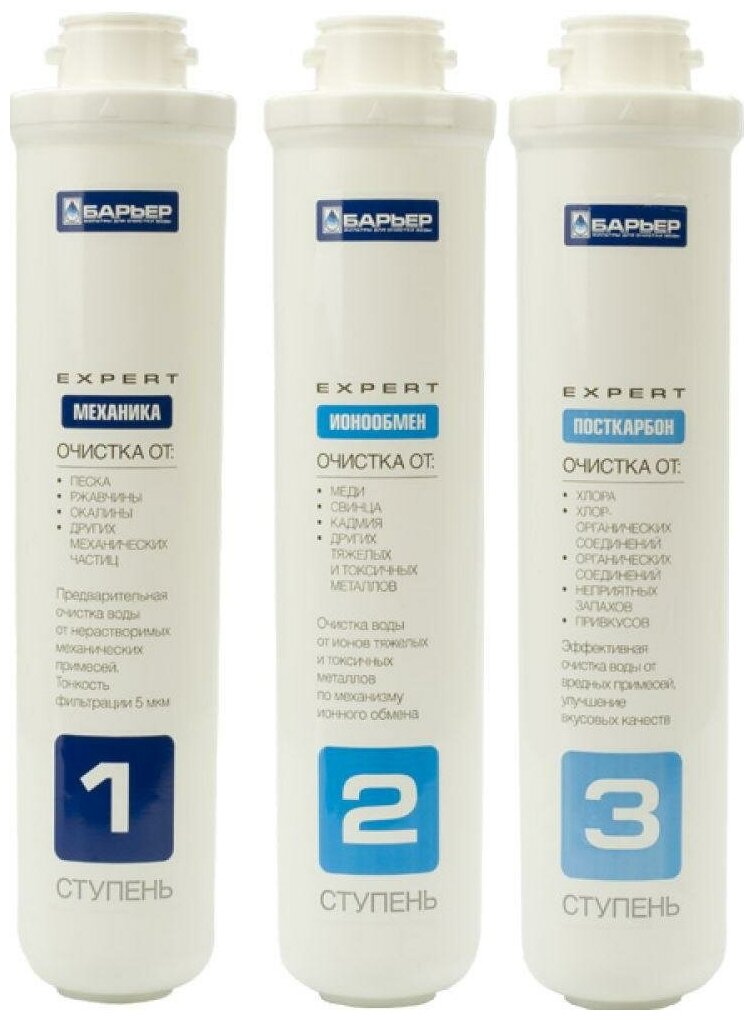 Комплект компактных сменных картриджей для фильтров. Применяется в трехступенчатых системах водоочистки «Эксперт Стандарт» для комплексной очистки водопроводной воды от основных содержащихся в ней вредных примесей.