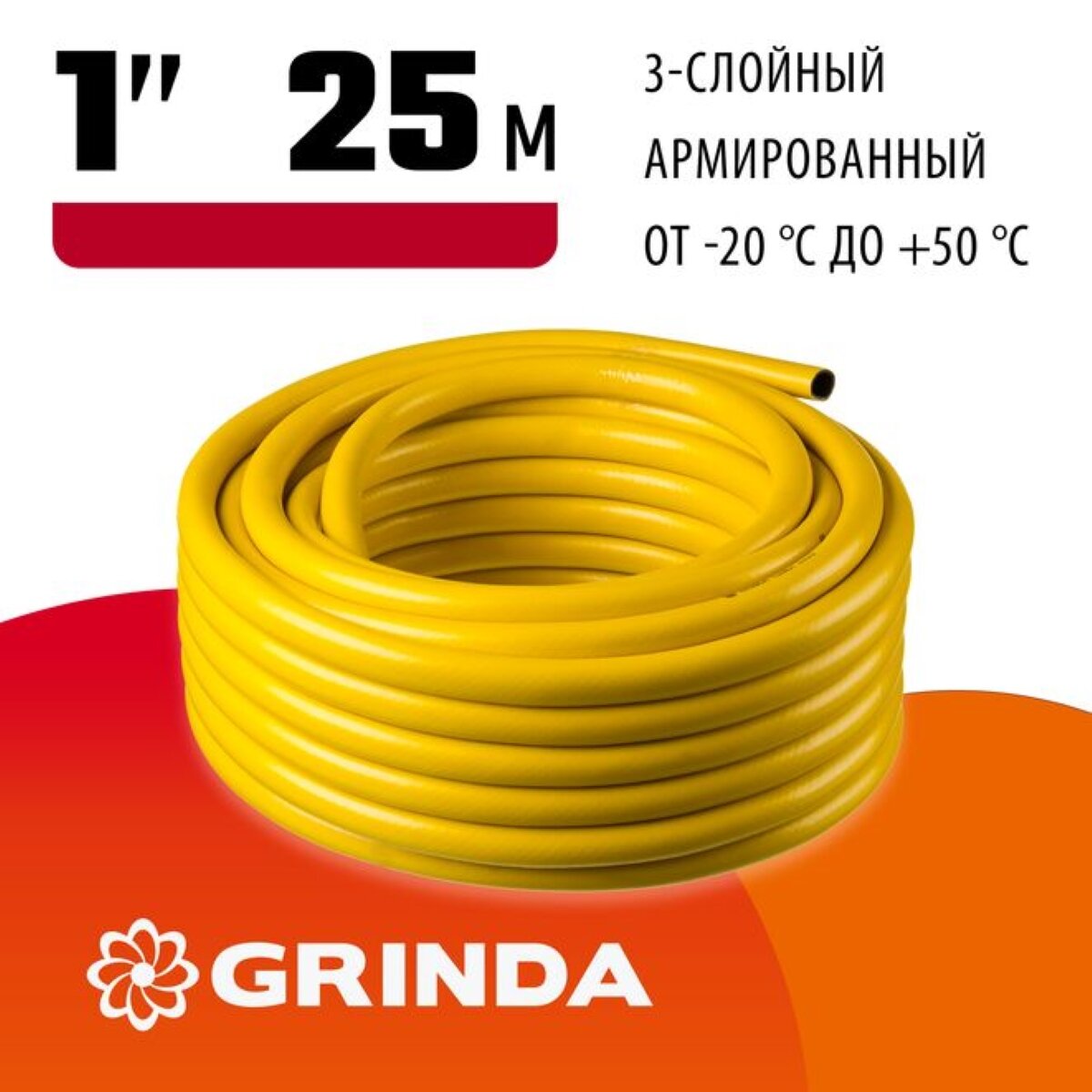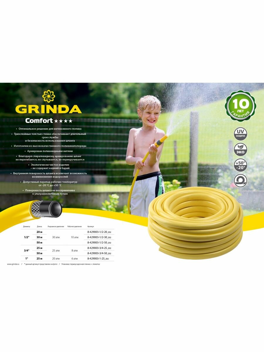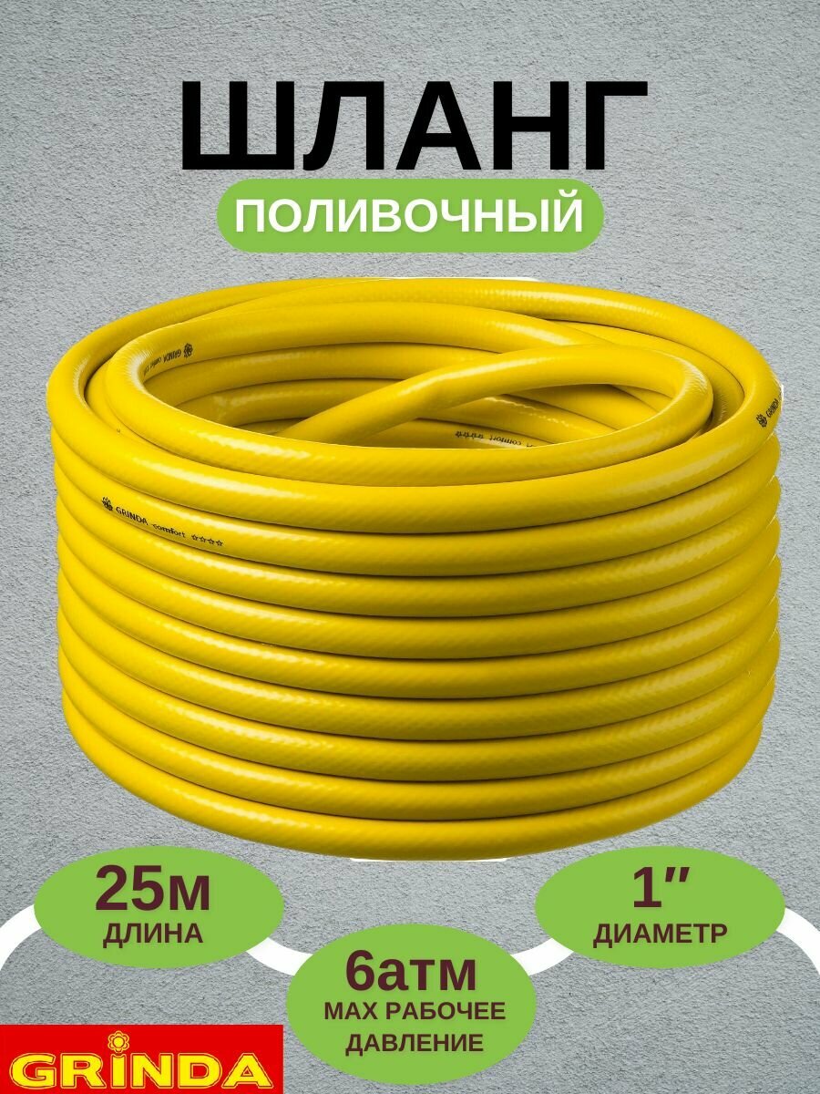 Шланг GRINDA comfort 1*25м 20 атм Шланг для полива армированный Grinda используется на садово-огородных участках при проведении поливочных или иных работ, требующих водоснабжения. Эластичный трехслойный шланг изготовлен из высококачественного ПВХ и армирован прочными полиэстеровыми нитями.