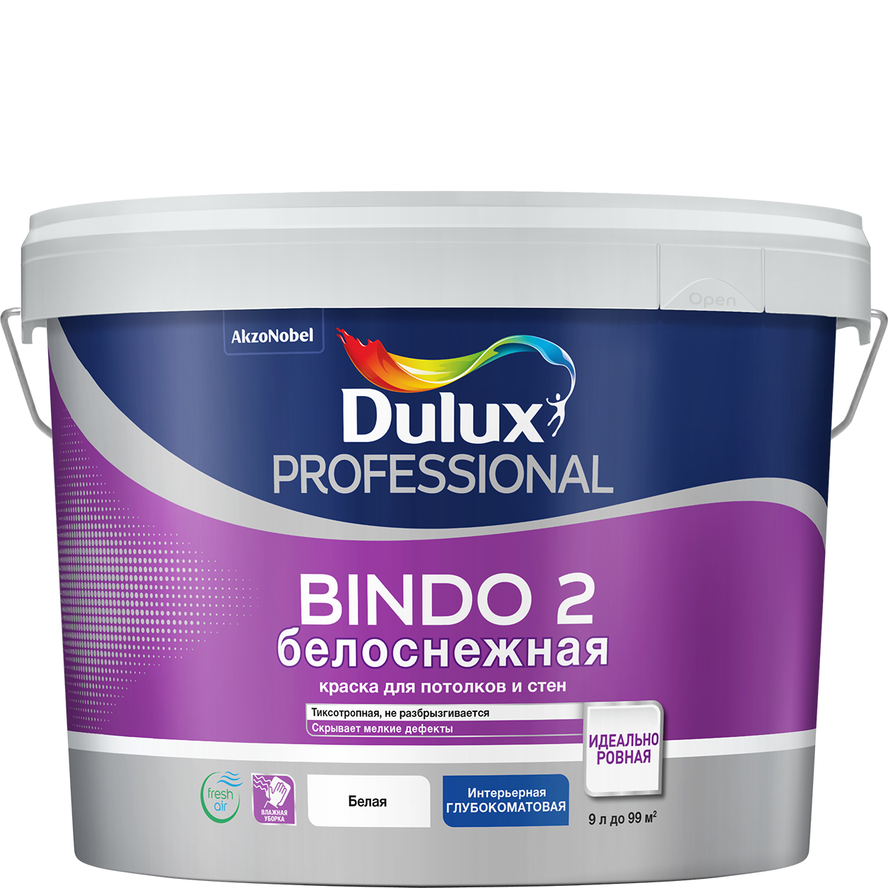 Глубокоматовая водно-дисперсионная краска Dulux Bindo 2 повышенной белизны для высококачественной отделки потолков и стен. Оптимальное открытое время помогает создать идеально ровную поверхность.