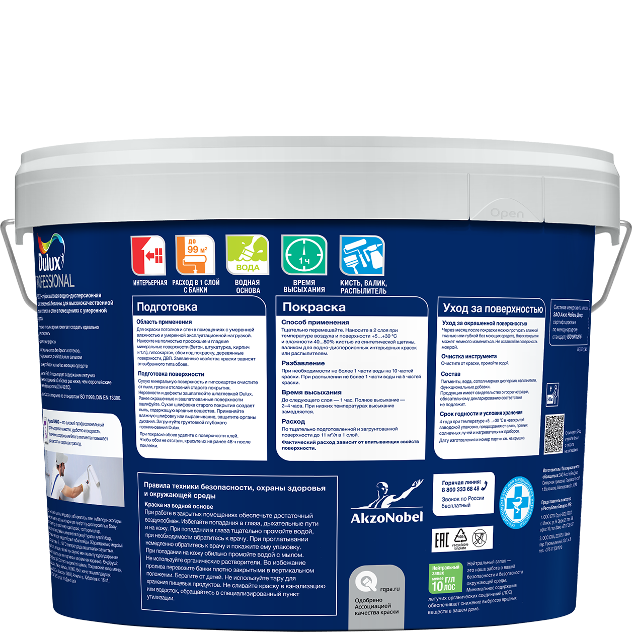Тиксотропная: наносится без брызг и потеков, легко разравнивается с нейтральным запахом. Экологичность подтверждена эко-сертификатом Листок Жизни . Краска Dulux Bindo 2 может применяться в детских и лечебно-профилактических учреждениях.