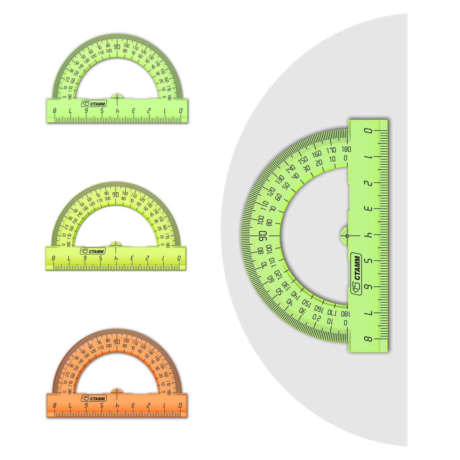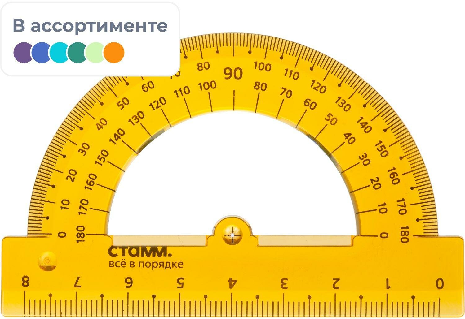 Транспортир Стамм изготовлен из прозрачного пластика. Имеет 180-градусную шкалу. Нижняя часть представляет собой линейку длиной 8 см. Шкалы и логотип нанесены на транспортир с помощью термопечати. Предназначены для чертежных работ.