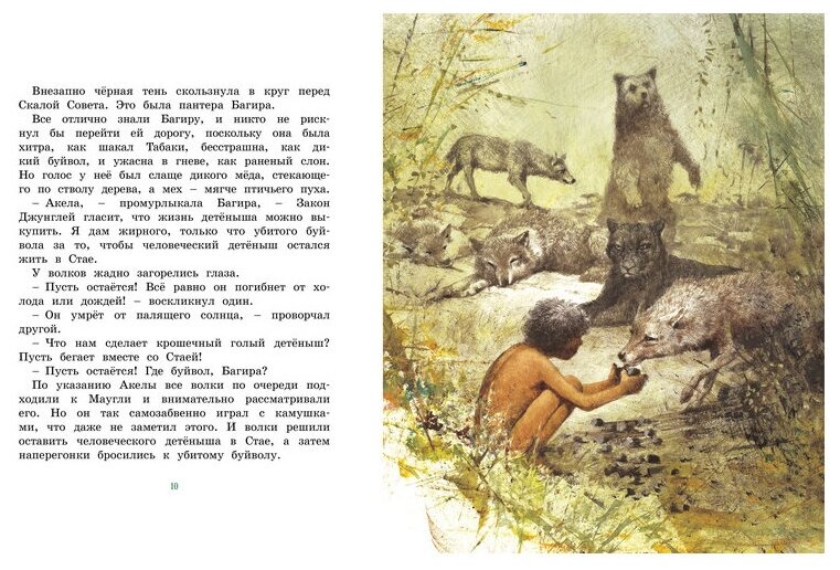 Маугли нужно читать в детстве, смотреть мультик, сравнивать с оригиналом. История о крепкой дружбе учит нас относиться более человечно к братьям нашим меньшим, любить природу. Также это произведение показывает нам, что с помощью храбрости можно преодолеть все преграды на своем пути. Единственное, на мой вкус цветные иллюстрации немного размытые и не очень красивые, но это вкусовщина, за нее балл снимать не буду.