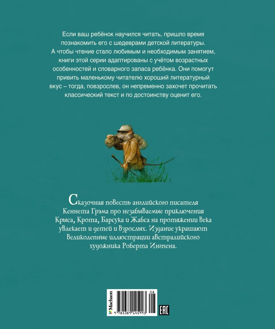 Сказочная повесть английского писателя Кеннета Грэма про незабываемые приключения Крыса, Крота, Барсука и Жаба на протяжении века увлекает и детей и взрослых. Издание украшают великолепные иллюстрации австралийского художника Роберта Ингпена.