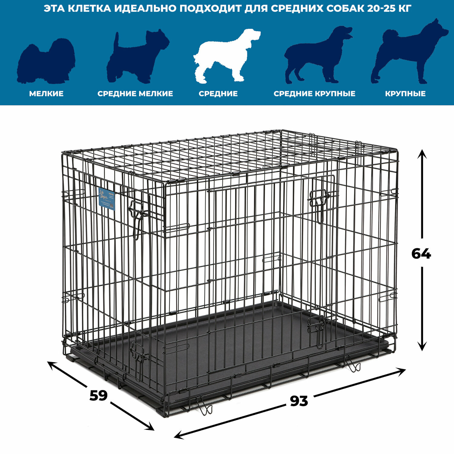 Клетка для домашних животных Life Stages с двумя дверьми. Признана лучшей Ветеринарными врачами и Бихевиористами. Устойчивая, крепкая клетка выполнена из качественного металла, обработана долговечным черным покрытием Electro-Coat, обеспечивает безопасность животного и хозяина. Двери расположены на смежных боковых сторонах. Удобный, крепкий двойной замок-задвижка позволяет закрыть клетку как снаружи, так и изнутри. В комплект включены: разделяющая панель, пластиковый поддон и специальные пластиковые ручки для удобной транспортировки клетки в сложенном виде. Закругленная угловая защита клетки обеспечивает безопасность питомцам и людям и не повреждает поверхность, на которой размещается. Разделяющая панель позволяет создавать универсальные отсеки. Поддон из композитного пластика легко моется. Клетка легко устанавливается и складывается без использования инструментов. В сложенном виде занимает мало места. Размер 91х61х69h см. Вес -14,1 кг (15,5 кг вес с упаковкой). Цвет - черный.