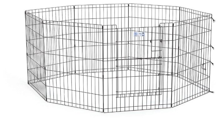 Вольер для животных 8 панелей с дверью для использования в помещении и на улице. Запатентованная дверная система MAXLock повышает безопасность, предоставляя множество точек блокировки по периметру двери. Эргономичная ручка-замок позволяет легко и удобно управлять дверью одним движением, без сгибания коленей. Прочное черное покритие вольера Electro-Coat обеспечивает долговечную защиту. Вольер легко складывается для удобного хранения и транспортировки, легко собирается, не требуется никаких инструментов или дополнительных деталей. В комплект включены угловые усилители, которые добавляют вес и поддерживают конфигурацию ограждения, они так же могут быть использованы для защиты напольного покрытия, и крепежи, которыми оснащена функциональная безопасная каркасная дверца. Ограниченная площадь1,5 квадратных метра. Возможные конфигурации вольера: квадрат, прямоугольник, восьмиугольник. Размер ячейки: 3,8х15,2 см. Вес 10,8 кг. (12 кг с упаковкой). Размер одной панели 61х91h см.