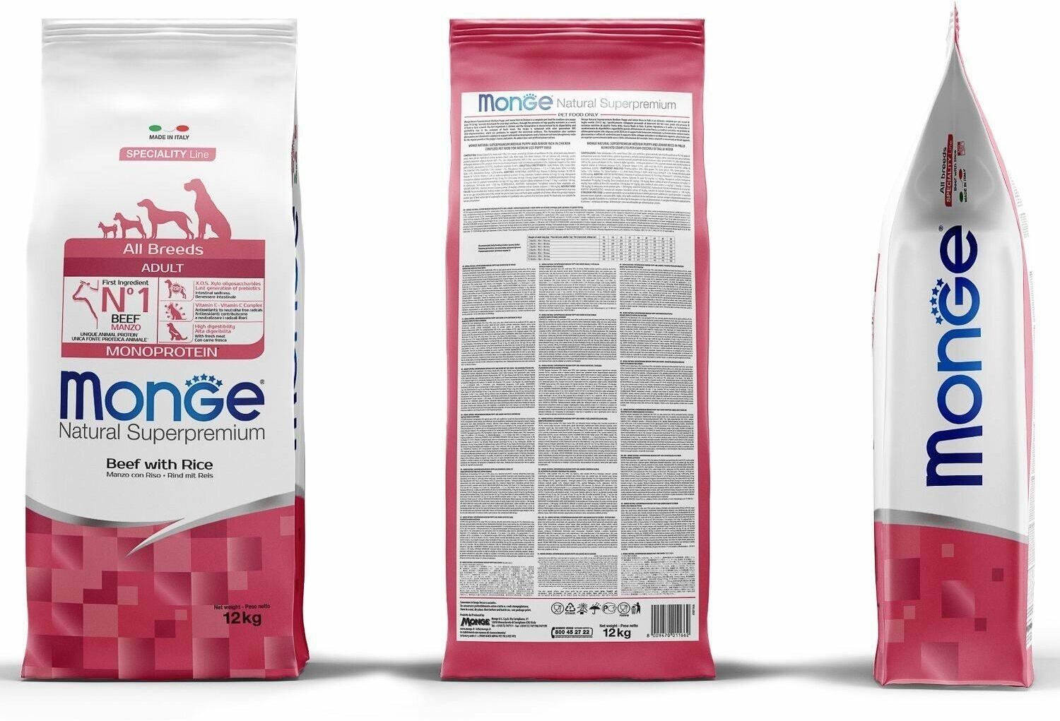 Сухой корм Monge для взрослых собак All Breeds Beef and Rice говядина/рис 12кг (70011341)