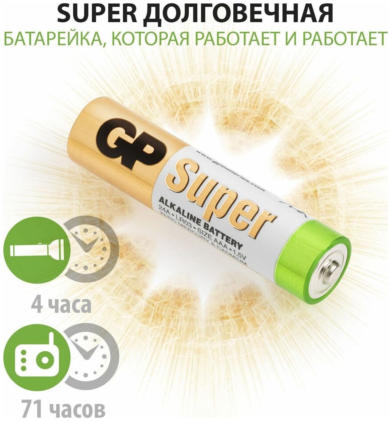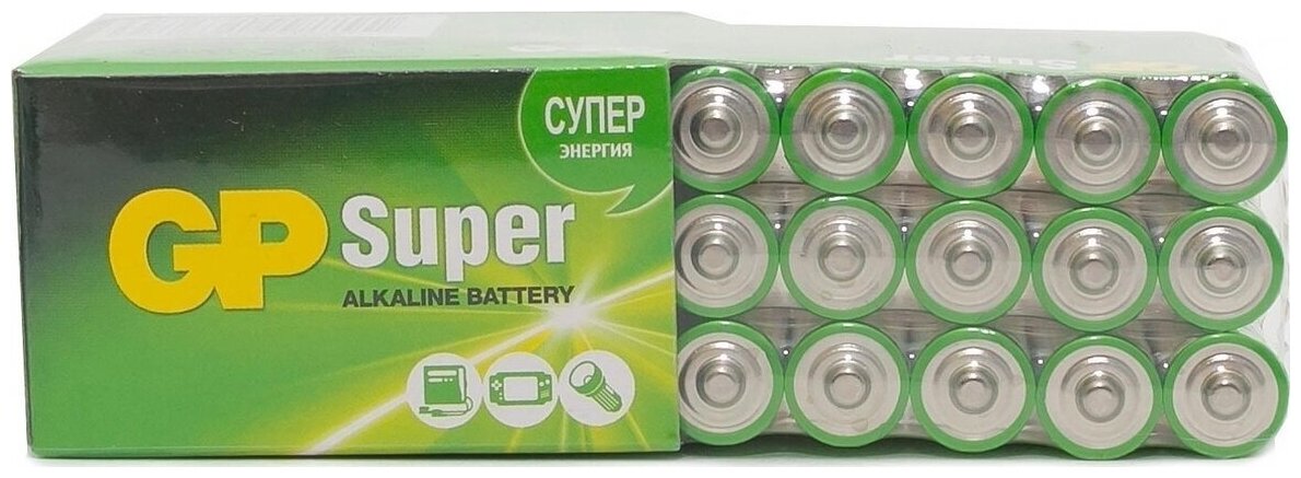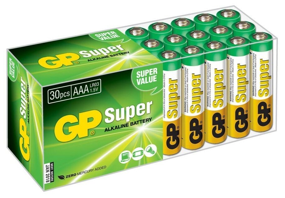 GP Super Alkaline— алкалиновые батарейки популярного мизинчикового формата. Эти элементы питания функционируют на улучшенной марганцево-цинковой системе и щелочном электролите, позволяющим им долго не терять заряд. В связи с этим алкалиновые батарейки отлично подходят для бытовых устройств, рассчитанных на долговременное использование: настенных часов, фонариков, будильников, детских игрушек, компьютерных мышей, пультов дистанционного управления и т. д. Щелочные батареи GP даже при повышенной нагрузке прослужат в несколько раз дольше обычных солевых батареек. Их срок годности достигает семи лет, тогда как солевые элементы успевают выдохнуться за два года. Вместительная и удобная упаковка из 30 батареек позволит разом оснастить все приборы в доме или на даче, а также послужит хорошим запасом источников энергии на несколько месяцев вперед.