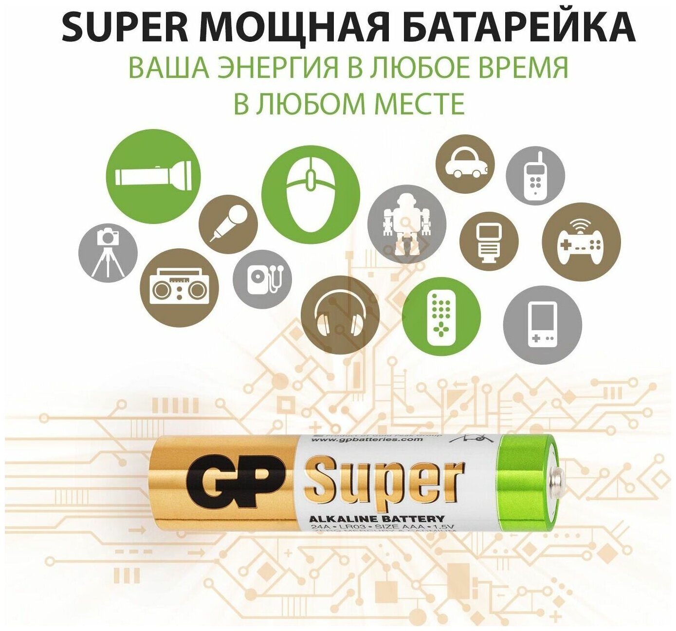 Батарейки, аккумуляторы и электроаксессуары GP