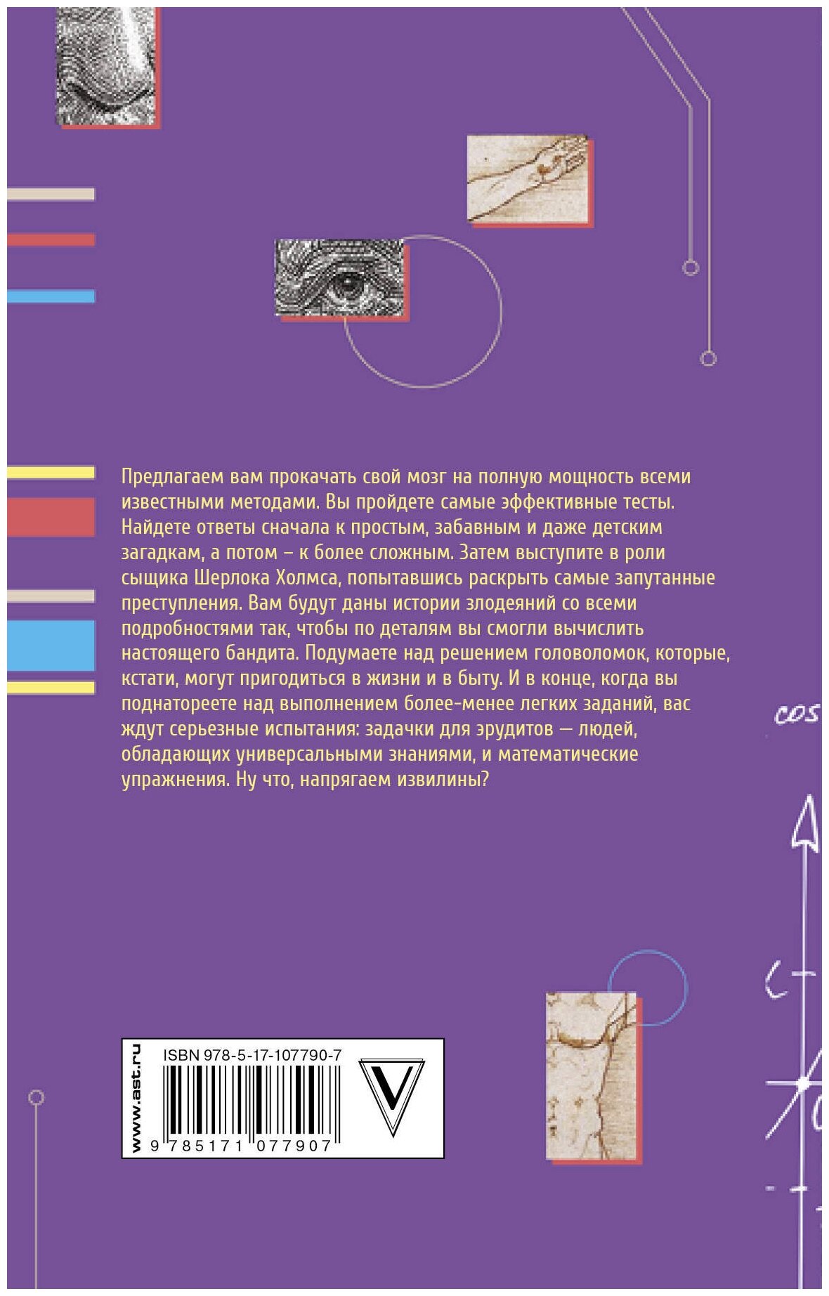 Предлагаем вам прокачать свой мозг на полную мощность всеми известными методами. Вы пройдете самые эффективные тесты. Найдете ответы сначала к простым, забавным и даже детским загадкам, а потом - к более сложным. Затем выступите в роли сыщика Шерлока Холмса, попытавшись раскрыть самые запутанные преступления. Вам будут даны истории злодеяний со всеми подробностями так, чтобы по деталям вы смогли вычислить настоящего бандита. Подумаете над решением головоломок, которые, кстати, могут пригодиться в жизни и в быту. И в конце, когда вы поднатореете над выполнением более-менее легких заданий, вас ждут серьезные испытания: задачки для эрудитов - людей, обладающих универсальными знаниями, и математические упражнения. Ну что, напрягаем извилины?