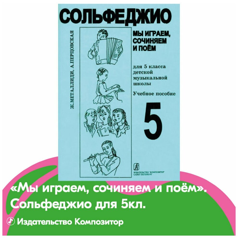 Это учебное пособие в восьми выпусках, охватывающих весь курс начального обучения сольфеджио, давно стало хрестоматийным в своем жанре, выдержав несколько переизданий. Традиционные темы курса осваиваются на высокохудожественном материале, аналогов которому не существует до сих пор — ведь авторство большинства пьес принадлежит одному из создателей учебника — самобытному, яркому петербургскому композитору Ж. Металлиди. В пособии впервые была предпринята попытка объяснять детям сложные теоретические темы не на специальном дидактическом материале, а на увлекательной, образно богатой музыке, из которой бы свободно «выводилось» любое теоретическое правило или определение. И эта методика себя полностью оправдала. Абсолютно к каждой теме авторами подобрана выразительная, запоминающаяся песня, с исполнения которой начинается занятие.К ноу-хау сборника относится и шумовой оркестр — исполнение музыки с аккомпанементом на детских ударных инструментах, доставляющее детям огромное удовольствие. В конце каждой тетради даются подробнейшие методические комментарии, распределенные по разделам курса. Из многообразных форм работ с примерными диктантами, интервальными и аккордовыми цепочками, ритмическими партитурами и проч. преподаватель может свободно компоновать курс, исходя из возможностей группы.Как и предыдущие выпуски, пособие для пятого класса содержит разделы, которые соответствуют основным темам программы пятого класса музыкальной школы. Вновь в занимательной, творческой форме изучаются совсем уже «взрослые» темы: обращения трезвучий главных функций лада, обращения септаккорда, малый вводный септаккорд, сложные ритмические рисунки… Поскольку учениками уже накоплен немалый теоретический «багаж», в конце пособия дается небольшая справочная теоретическая таблица по основополагающим аккордам в гармонии.Не перечисляя здесь всех достоинств пособия (основной принцип подачи материала здесь остается прежним, акценты, опять же, сделаны на подробнейших методических комментариях и разнообразнейших формах работы над изучаемым материалом), остановимся лишь на одном отличительном качестве этого сборника. Это несомненная «взрослость» музыкального материала, другими словами — определенная психологическая глубина пьес, на которую вольно или невольно оказываются ориентированы юные музыканты. Такова песня «Уходит детство» из замечательной кантаты «Мир глазами детей» Ж. Металлиди, меланхоличная соль-диез минорная прелюдия Рахманинова и многие другие классические музыкальные образцы, воспитывающие прекрасный вкус и обогащающие внутренний мир ребенка.