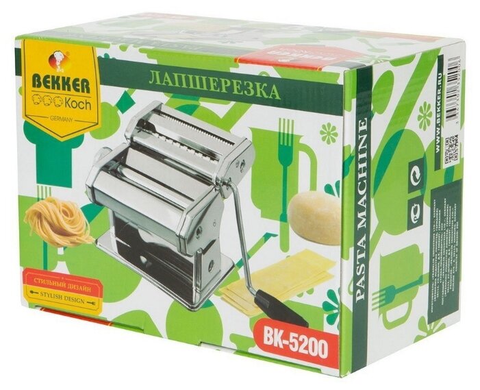 | Прочие особенности и свойства | Лапшерезка Bekker BK 5200 произведена в Германии и представляет собой образчик настоящего тевтонского качества. Девайс состоит из двух частей. Одна раскатывает тесто различной толщины, вторая режет тонкую и широкую лапшу. Задайте толщину лапши от 0.5 до 3 миллиметров. Управляться с лапшерезкой легко – тем паче, она крепится к столу специальной струбциной и не ерзает по поверхности. Сперва вы пропускаете подготовленную массу через пару валиков на максимальной толщине. Потом ставите переключатель на минимальную толщину лапши и, после того как лепешка подсохнет, пропускаете ее через лапшерезку еще раз. Помимо лапши, тесто отлично подойдет для домашних пельмешек и прочих кулинарных изысков в роде лазаньи. А после того, как покушаете, вымойте съемный блок нарезных валов. Сделать это легко и просто! Тип:ручная. |