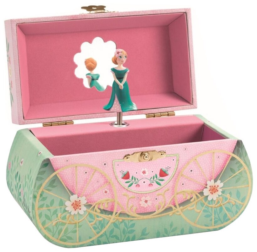 Djeco Музыкальная шкатулка Карета Декоративная шкатулка стилизована под карету сказочной принцессы, ее дизайн очень интересный и привлекательный. Внутри шкатулка вместительная. Откинув крышку, девочки смогут примерять свою бижутерию, любуясь собой в фигурное зеркальце и слушать приятную мелодию. Декоративная шкатулка имеет оригинальный и очень нежный дизайн, поэтому непременно понравится своей новой владелице и станет украшением интерьера девичьей комнаты. Шкатулка выполнена в виде сказочной кареты розового цвета, украшенной растительным орнаментом с коваными колесами и окошками с красивыми шторками. В окошке кареты можно увидеть принцессу, путешествующую вместе со своими домашними любимцами – кошечкой и птичками. А если отрыть замочек и откинуть крышку шкатулки, внутри можно увидеть миниатюрную фигурку принцессы в красивом бальном платье. Принцесса сможет удивить красивым танцем под звуки замечательной музыки Льва Фридмана. Внутри ларца есть фигурное зеркальце, шкатулка достаточно вместительна, внутри находится несколько отсеков для хранения детской бижутерии и других драгоценностей. Шкатулка выполнена из натуральной древесины с приятной для тактильной чувствительности ребенка текстурой, тщательно ошлифована и окрашена безопасными красителями. Изделие выполнено из экологически безопасных материалов, продукция имеет требуемую сертификацию качества. Игрушка поставляется в красиво оформленной подарочной упаковке.