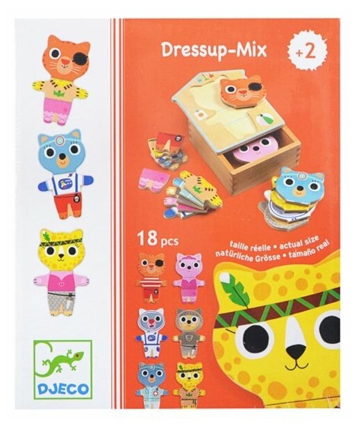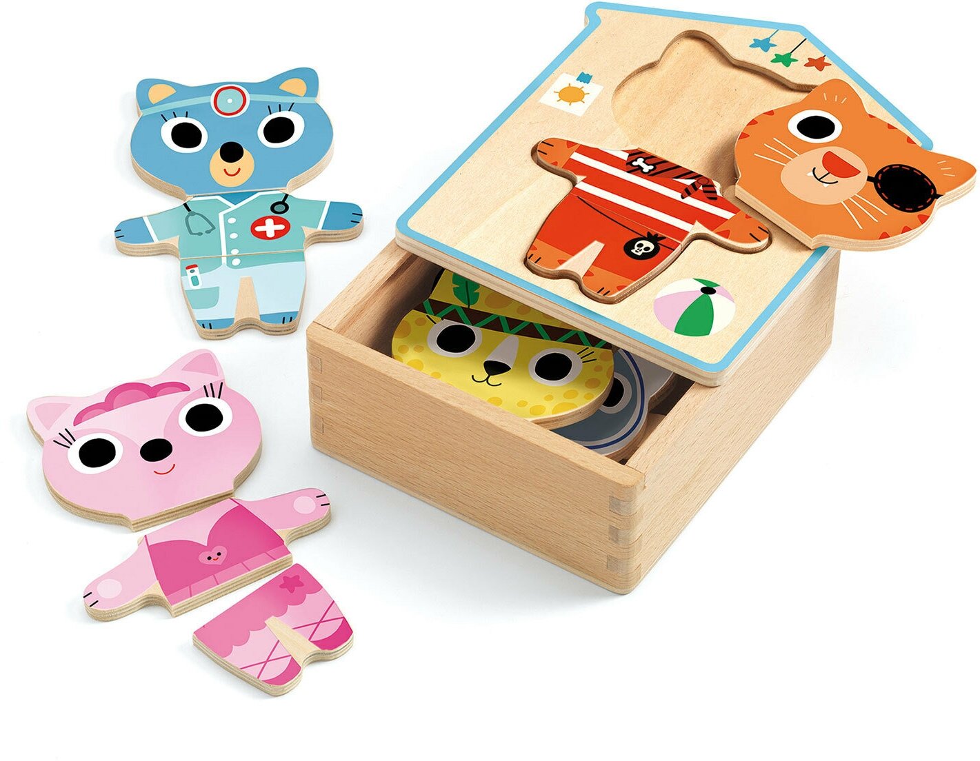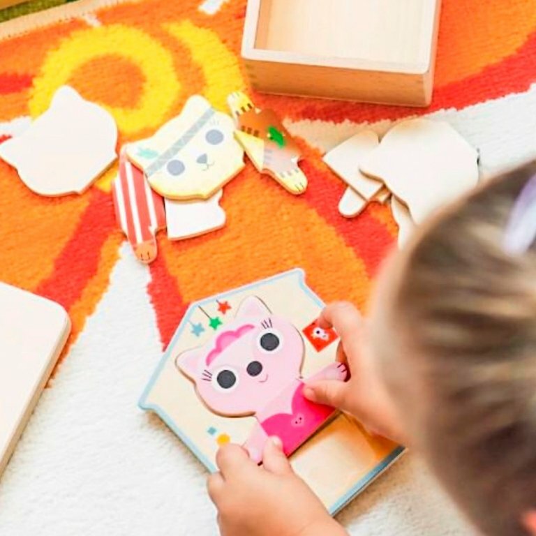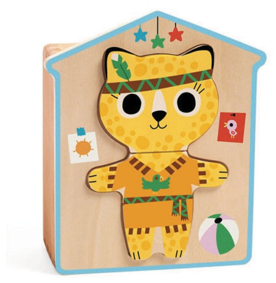 Игра представлена в виде деревянной коробочки, в которой хранятся детали пазла, крышка выполнена в виде домика с выемкой. Ребенку необходимо собрать из трех деревянных деталей забавных котиков в разной одежде: кошечка-балерина, котик-доктор, котик-пират, котик-индеец. Малыш сможет узнать, как выглядят разные костюмы.