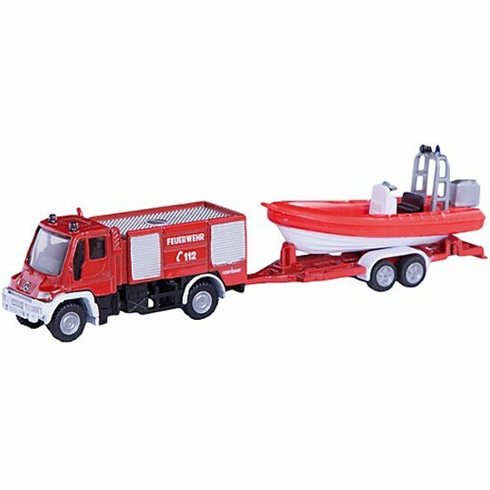 Пожарная машина с катером от немецкого производителя Siku прекрасно дополнит коллекцию моделей специальной техники.