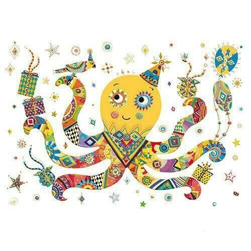 Очаровательный осьминог, изображенный на открытке от компании «Turnowsky» станет милым дополнением к подарку на любой праздник. Осьминог выполнен в виде необычных разноцветных геометрических фигур, на голове у него праздничный колпак в щупальцах воздушные шарики и подарки.