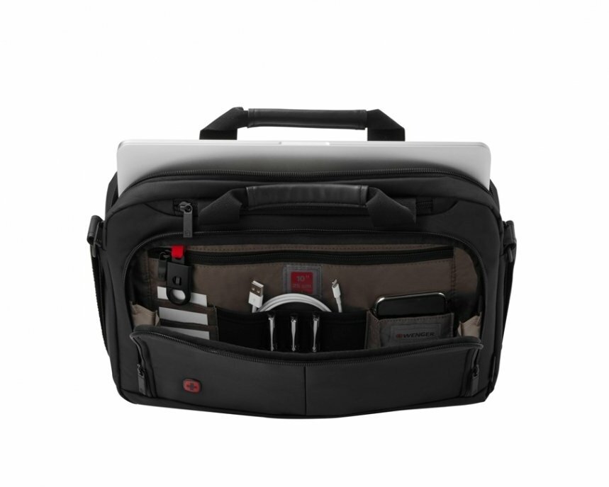 Портфель для ноутбука 14'' WENGER Source 2 основных отделения: - Отделение для ноутбука с мягкими стенками 14'' - Отделение с большим карманом- органайзером и карманом для планшетного компьютера - Карман для планшетного компьютера: Карман на молнии в переднем отделении портфеля имеет устойчивую к царапинам подкладку и предназначен для переноски планшетного компьютера - Карман-органайзер для мелких предметов: Большой карман-органайзер включает ключницу, многочисленные кармашки для пишущих принадлежностей, документов и карты памяти, мобильного телефона, проводов и адаптеров - Карман для вещей первой необходимости: Карман в верхней части портфеля подходит для хранения аксессуаров и прочих необходимых вещей - Рукав для крепления к чемодану: Специальный рукав позволяет зафиксировать сумку на телескопической ручке чемодана для удобного перемещения нескольких предметов багажа - Съемный плечевой ремень: Съемный, регулируемый по длине наплечный ремень с мягкой накладкой Материал - нейлон / ПВХ Размер - 39 x 8 x 25 см. Объем - 5 л.