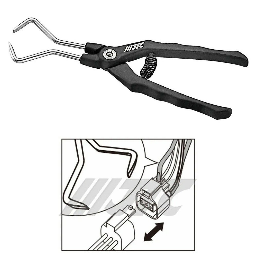 Клещи JTC используются для разъединения электрических разъемов на большинстве автомобилей. V-образная форма зажима позволяет использование клещей в узком пространстве. Подходят для разъединения проводки за спидометром. Назначение JTC-: Разъединение контактов электрики автомобилей. Применение JTC-: Электрические коннекторы автомобиля. Характеристики JTC: Тип инструмента: Съемник коннектора. Длина (общая): 185 мм. Размер: 285х120х15 мм.Вес: 0,106 кг.