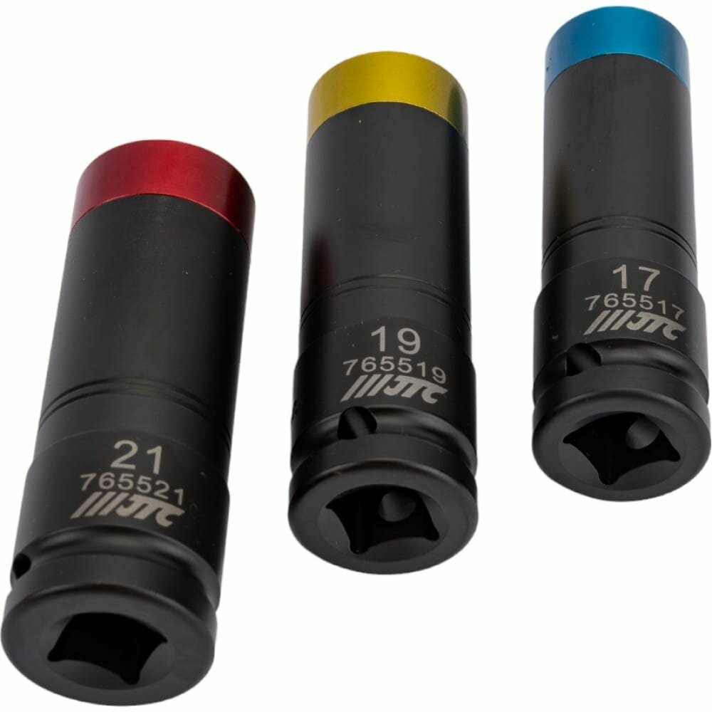 Набор головок ударных для литых дисков 17-19-21 мм L=85 мм 3 предмета.Впресованное кольцо из особопрочной стали обеспечивает головке дополнительную прочность. Легкоснимающаяся прозрачная втулка из ПВХ для безопасной работы с дисками. Размеры втулок, мм: 17, 19, 21.
