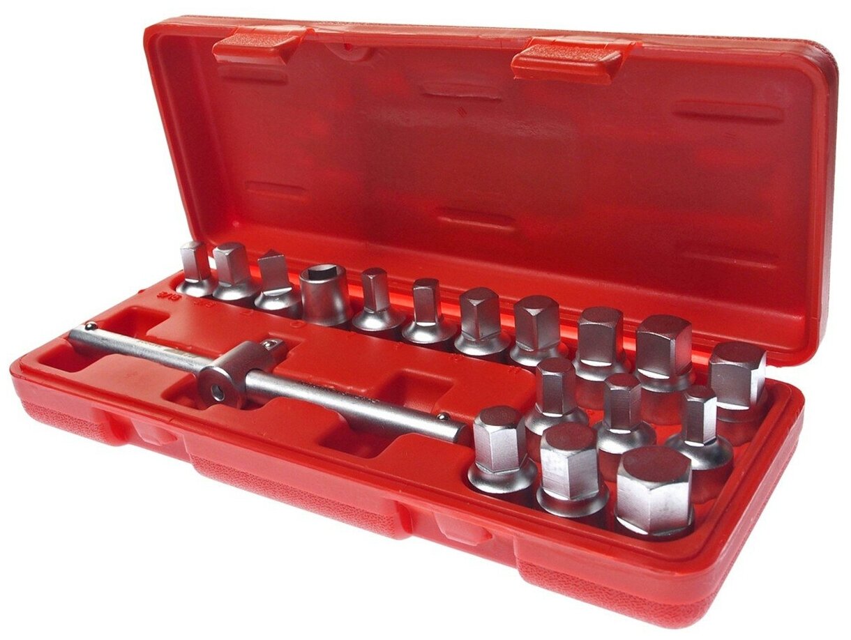 Набор головок для отворачивания масляных пробок, 18 пр. JTC - комплект приспособлений для авторемонта. Пластиковый кейс защищает инструмент от влаги и пыли, а также обеспечивает удобство транспортировки.