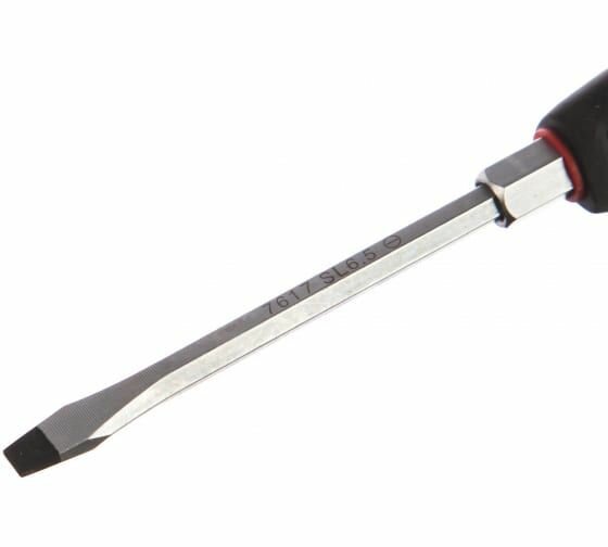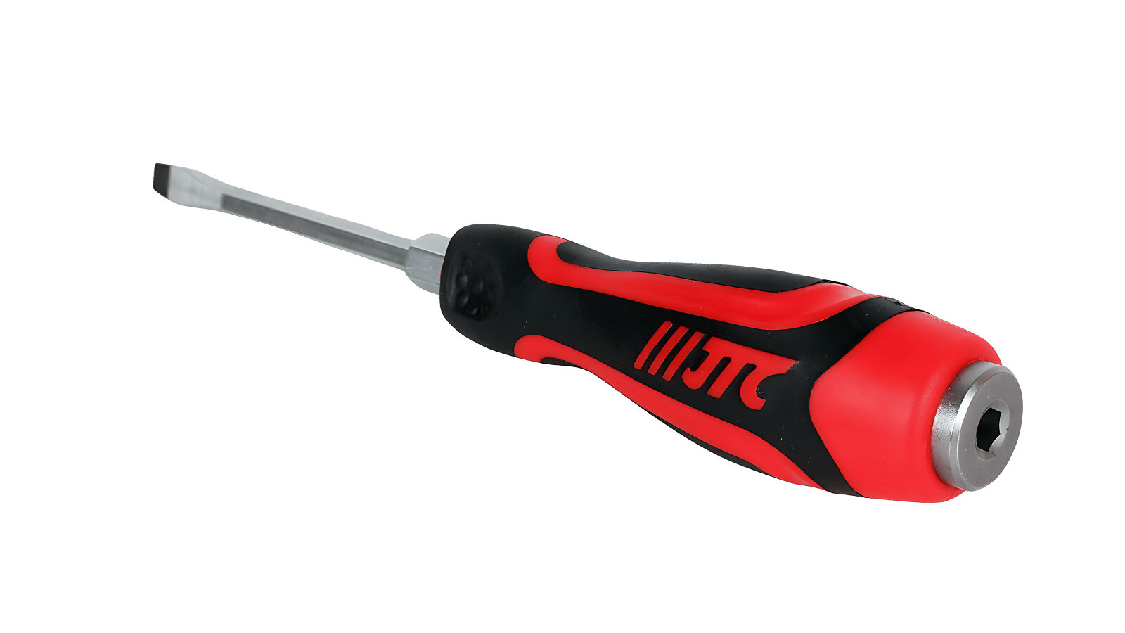 Отвертка шлицевая SL6.5 х 100мм усиленная со сквозным стержнем JTC /1 JTC-. Материал: SNCM8660. Стержень отвертки стальной, сквозной, шестигранный. Покрыт сатин-хромом, жало - оксидированно. Рукоятка имеет треугольную форму. Изготовлена из двухкомпонентного материала (PP + TPV). Обладает стойкостью к маслам, бензину и другим химическим веществам. Стандарт DW 6.5. Хвостовик под шестигранный ключ и шестигнанник на стержне под рожковый ключ могут быть использованы для передачи дополнительного усилия.