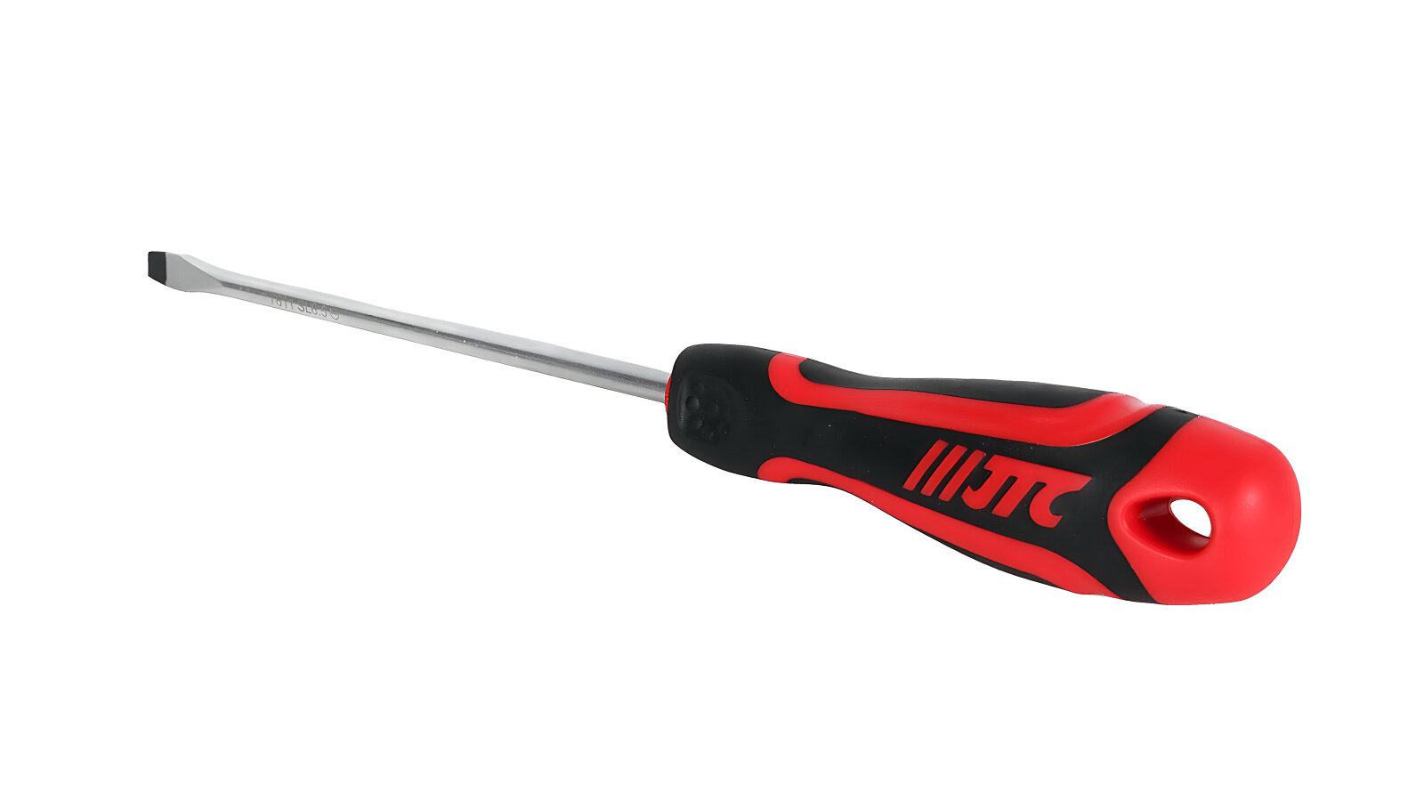 Отвертка шлицевая усиленная JTC JTC- представляет собой простой и эффективный инструмент, оснащенный удобной рукояткой и прочным стержнем.Преимущества: Высокое качество изготовления и материалов: стержень отвёртки выполнен из высококачественной стали, покрытой сатин-хромом, а жало оксидировано Хорошая эргономика: рукоятка имеет удобную форму, изготовлена из двухкомпонентного материала (РР + TPV), удобна в использовании и устойчива к маслам, бензину и другим химическим веществам Усиленная конструкция обеспечивает эффективную работу