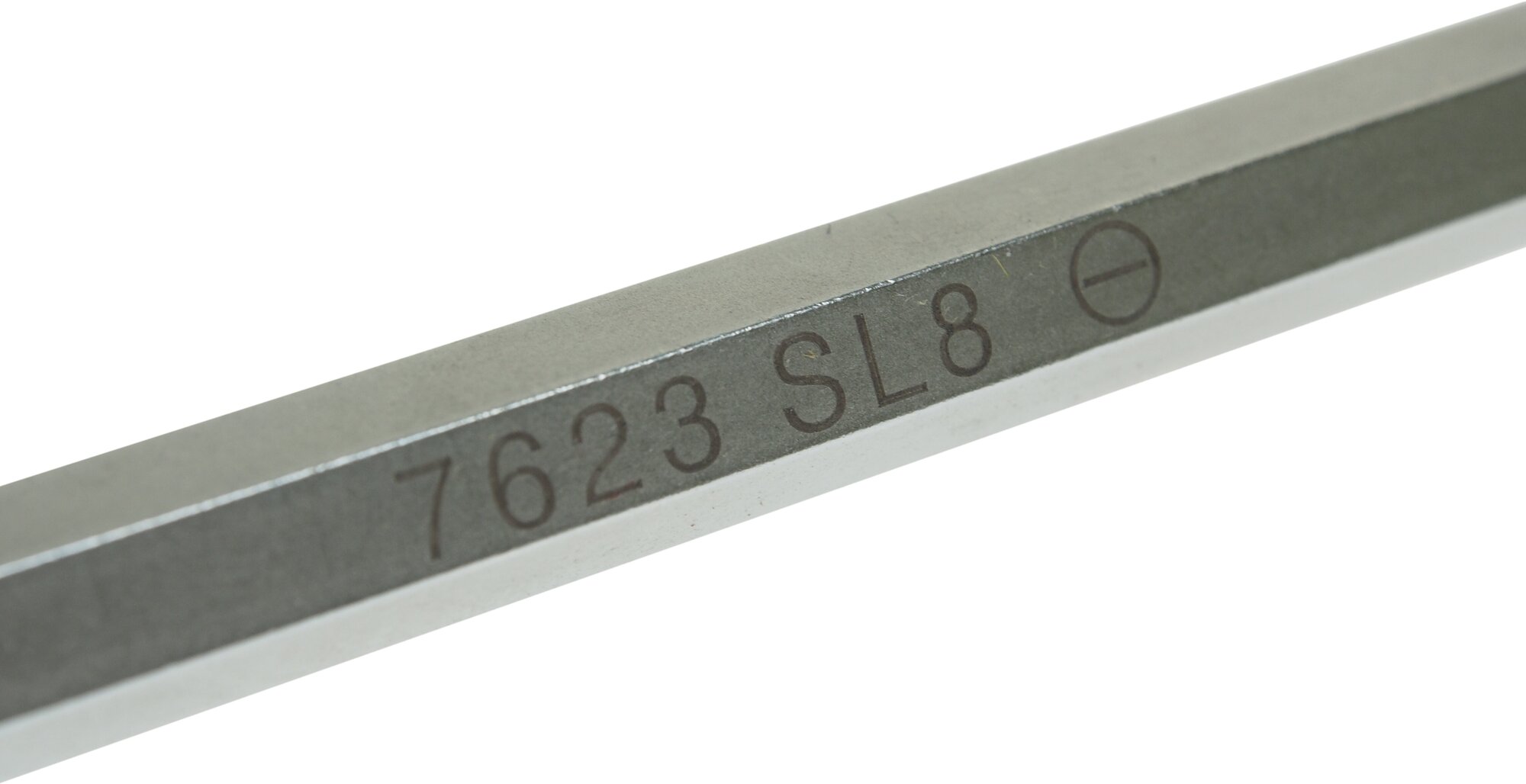 Отвертка шлицевая SL8.0 х 250мм усиленная со сквозным стержнем JTC /1 JTC-. Материал: 8NCM8660. Стержень отвертки стальной, сквозной, шестигранный. Покрыт сатин-хромом, жало оксидировано. Рукоятка имеет треугольную форму. Изготовлена из двухкомпонентного материала (РР + TPV). Обладает стойкостью к маслам, бензину и другим химическим веществам. Стандарт DW 6.5. Хвостовик под шестигранный ключ и шестигранник на стержне под рожковый ключ могут быть использованы для передачи дополнительного усилия. Размер: SL8.0x250. HEX: Н12.