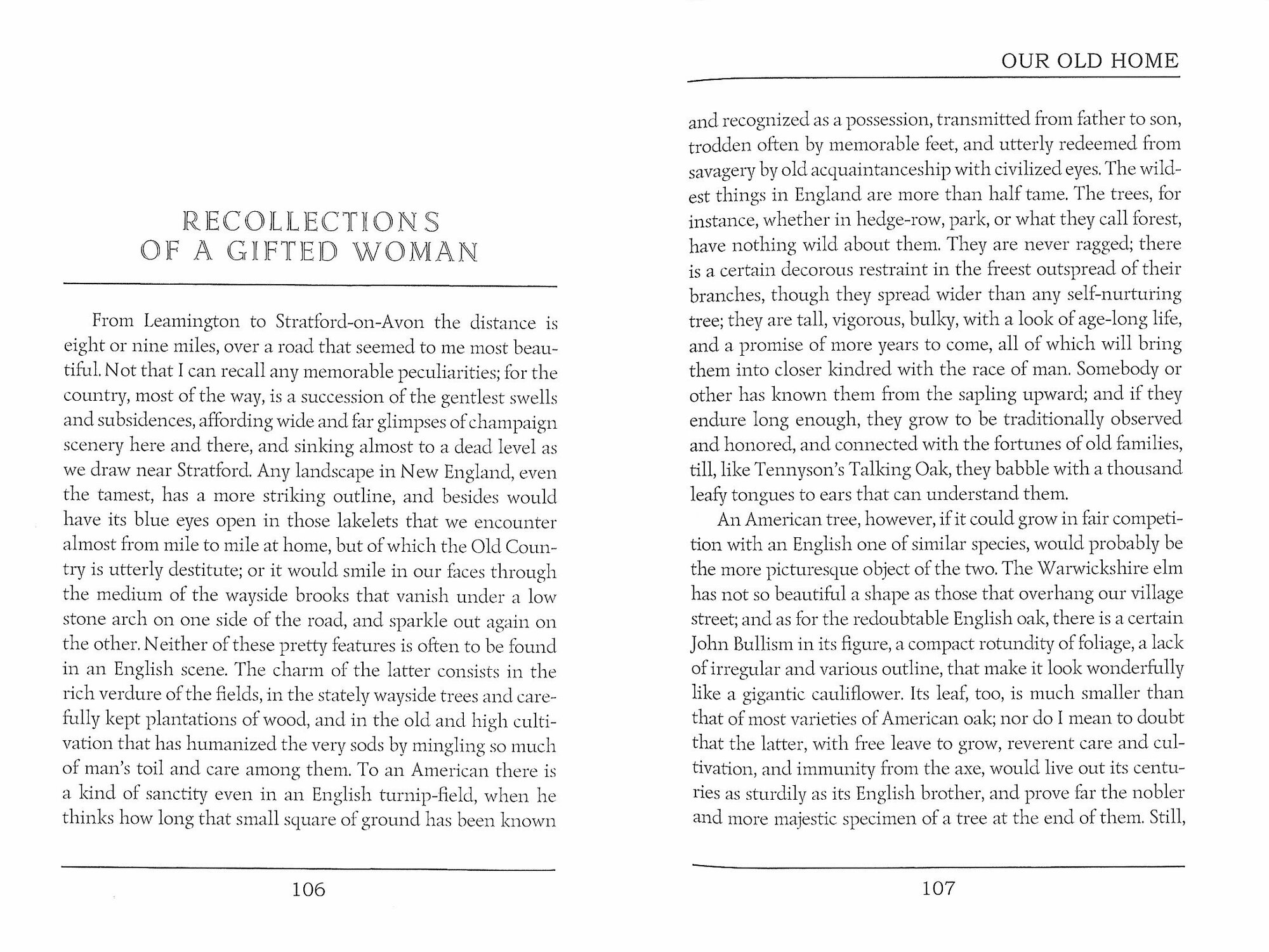 Nathaniel Hawthorne was an American novelist, a dark romantic, and short story writer. Our Old Home is a collection of essays, based on Hawthorne's stay in England from 1853 to 1857 as American Consul in Liverpool. It was first published in the form of a series of travel papers for "The Atlantic Monthly". In his essays Hawthorne aimed to show us the splendors of London, and the horrors of the poverty that so many suffered.