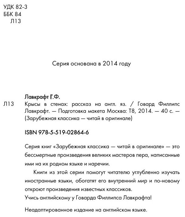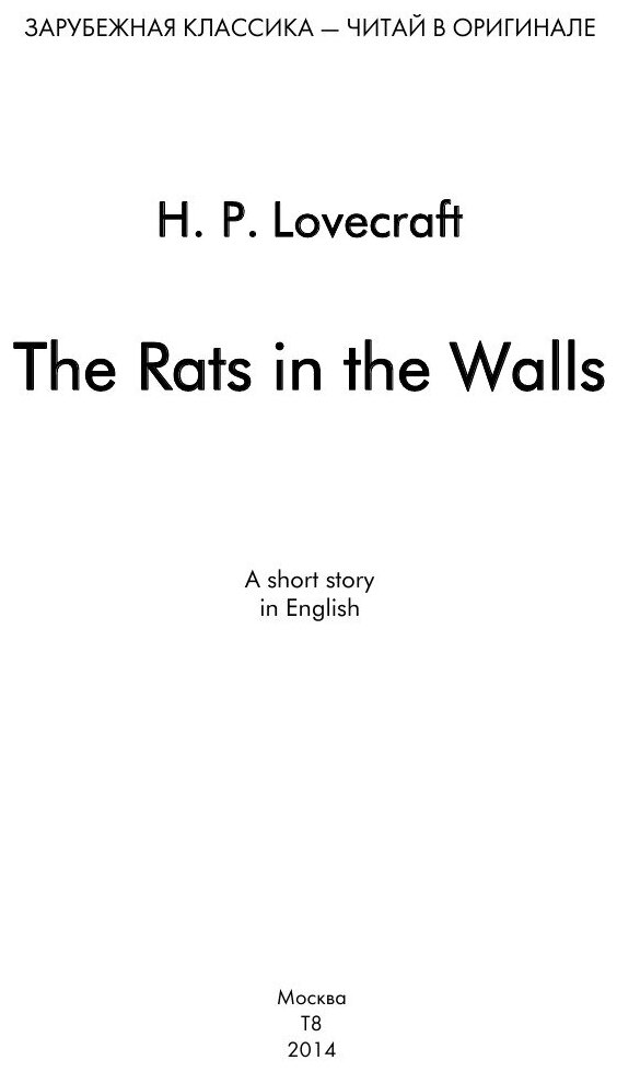 Ужастик Говарда Филлипса Лавкрафта «Крысы в стенах» на английском языке, входит в серию книг «Зарубежная классика — читай в оригинале». Эта коллекция собрана из бессмертных произведений великих мастеров пера, написанных ими на их родном языке. Книги из этой серии помогут читателю углублённо изучать иностранные языки, обогатят его внутренний мир и по-новому откроют произведения известных классиков. Учись английскому у Говарда Филлипса Лавкрафта! Рассказ: ужасы, мистика