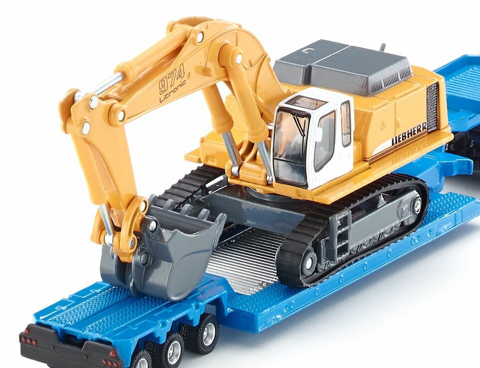 Игрушечные модели тягач с экскаватором Liebherr 974 на прицепе, корпуса тягача и экскаватора выполнены из металла, колёса выполнены из резины и вращаются, можно катать. Стрела экскаватора и ковш подвижные, гусеницы выполнены из резины и подвижны, экскаватор можно катать.