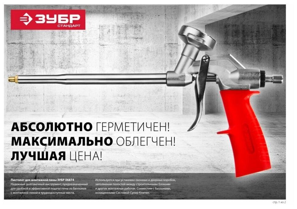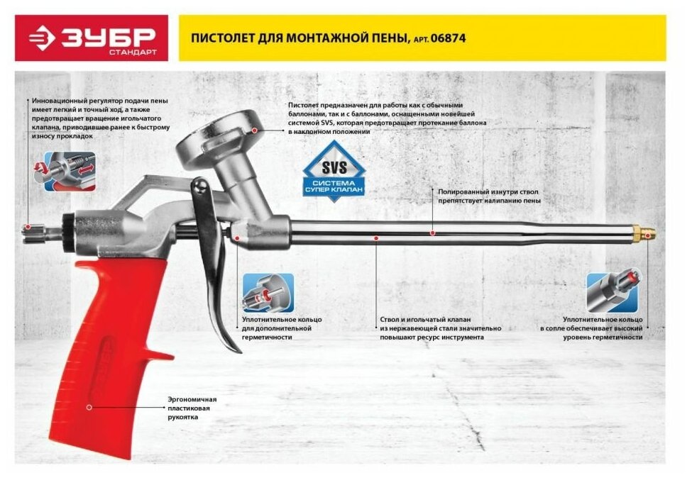 Профессиональный пистолет Зубр "Стандарт" - это надежный долговечный инструмент, предназначенный для удобной и эффективной подачи пены из баллонов с монтажной пеной в труднодоступные места. Используется при установке оконных и дверных коробок, заполнении полостей между строительными блоками и других монтажных работах. Совместим с баллонами, оснащенными Системой Супер Клапан.