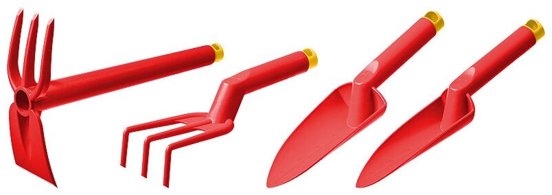 | Комплектация | широкий посадочный совок; узкий посадочный совок; рыхлитель; мотыга-рыхлитель |