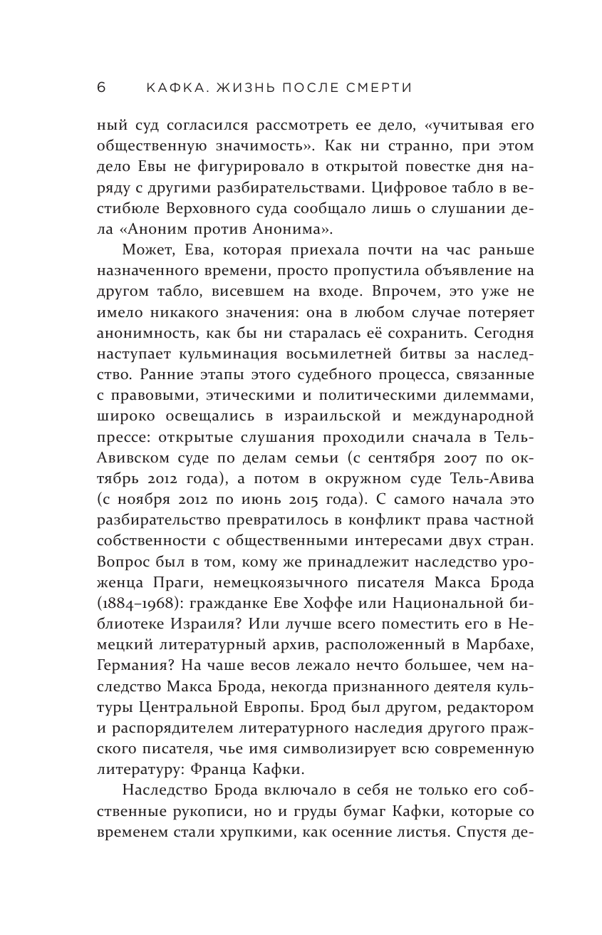 Оень любопытное изложение судебных процессов о наследии бумаг Франца Кафки, которые достались его лучшему другу Максу Броду и совсем недавно перешли в собственность Национальной библиотеки Израиля. Автор рассказывает о некоторых аспектах биографии Кафки, Брода и наследниц последнего, но большую часть повествования повсящает вопросу, связанному с этим судебным процессом: какой же литературе принадлежит Франц Кафка - немецкой или еврейской? Ответ на этот вопрос не столь однозначен, как может кому-то показаться, и думаю вопрос по-прежнему останется дискуссионным. Наверное, благодаря этому Кафка и остаётся одним из самых знаменитых писателей XX века.