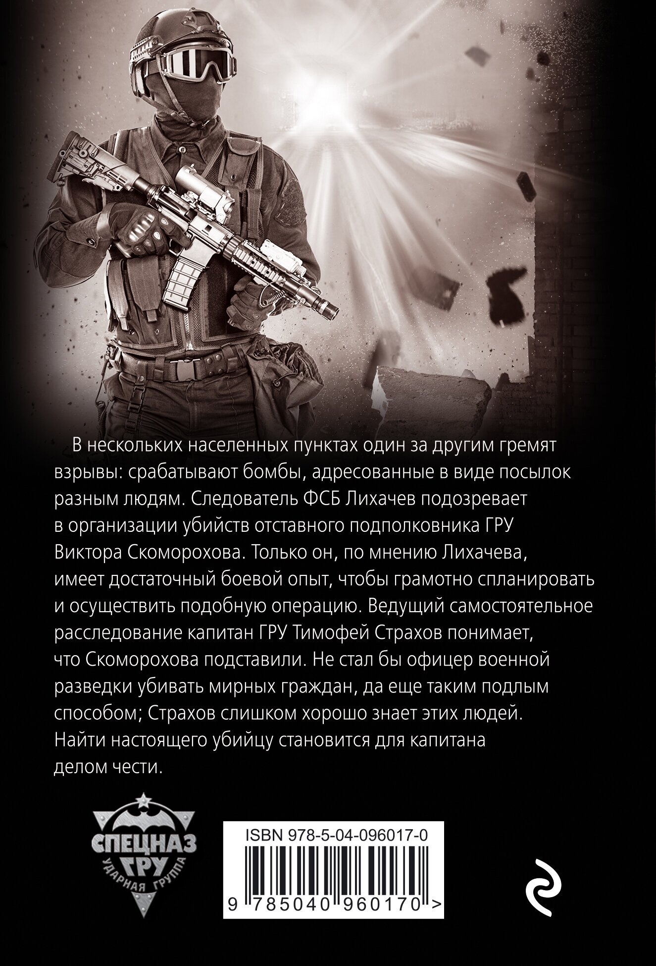 Ударные военные романы, написанные ветераном спецназа ГРУ. Реальные герои в реальных условиях для настоящих читателей. Суммарный тираж книг автора – более 4 миллионов экземпляров. В нескольких населенных пунктах один за другим гремят взрывы: срабатывают бомбы, адресованные в виде посылок разным людям. Следователь ФСБ Лихачев подозревает в организации убийств отставного подполковника ГРУ Виктора Скоморохова. Только он, по мнению Лихачева, имеет достаточный боевой опыт, чтобы грамотно спланировать и осуществить подобную операцию. Ведущий самостоятельное расследование капитан ГРУ Тимофей Страхов понимает, что Скоморохова подставили. Не стал бы офицер военной разведки убивать мирных граждан, да еще таким подлым способом; Страхов слишком хорошо знает этих людей. Найти настоящего убийцу становится для капитана делом чести.