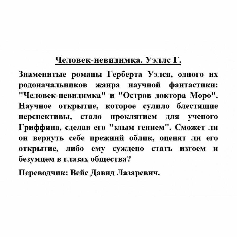 Знаменитые романы Герберта Уэлса, одного их родоначальников жанра научной фантастики: "Человек-невидимка " и "Остров доктора Моро". Научное открытие, которое сулило блестящие перспективы, стало проклятием для ученого Гриффина, сделав его "злым гением". Сможет ли он вернуть себе прежний облик, оценят ли его открытие, либо ему суждено стать изгоем и безумцем в глазах общества?